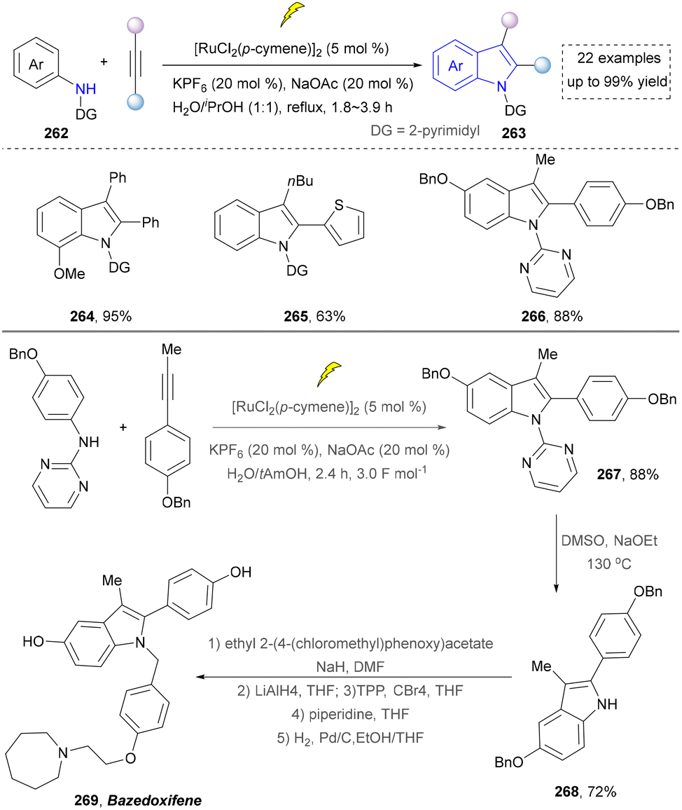 In 2018, the same team continuously developed the electrochemical dehydrogenative alkyne annulation to furnish indoles.172 This method employed an undivided cell system, where a ruthenium complex catalysed the [3+2] cyclization of aniline derivatives with available alkynes to construct indole scaffolds while releasing hydrogen gas (Scheme 28). The reaction demonstrated excellent air stability in water/alcohol mixed solvents and could be performed on a gram scale. Even though the ruthenium catalyst was required, and the substrate scope (264–266) was expanded by intermolecular synthesis. The utility of this strategy was further demonstrated by the concise synthesis of bazedoxifene (269) from the key intermediate (267), which was readily prepared under slightly modified conditions (H2O/tAmOH replace H2O/iPrOH, 3.0 F mol−1 replace 3.2 F mol−1, 2.4 h) and required further elaboration. A notable limitation, however, is the strategy's exclusive compatibility with secondary amines.