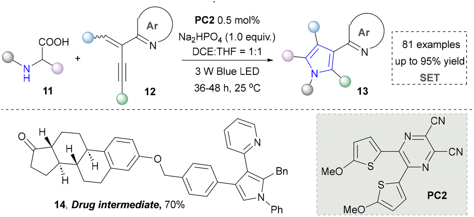 Taking advantage of the high reactivity of free radicals, a photocatalytic strategy for the construction of highly complex pyrroles was reported by Wu's group.86 In this case, α-bromoketone was activated to form the carbon radical via a single electron transfer (SET) process, which further underwent the radical addition into the enamine to afford the valuable pyrroles. Compared with the traditional Hantzsch reaction, this strategy is characterized by completion within merely 2 hours under blue-light irradiation at room temperature. Later, a similar strategy of using N-tosylhydrazones as radical precursors via iodine-mediated photo-catalysis under visible light irradiation was also reported by Adimurthy's group.87 In addition, the utilization of amino acids as nitrogen sources and the radical precursors was further developed by Jiang's group in 2021 (Scheme 2).88 This method featured easy availability of raw materials, high synthetic efficiency and good functional group tolerance. Diverse pyrroles with tri- and tetra-substituents at the carbon positions were obtained successfully in good to excellent yields through redox-neutral radical additions, cyclisation and aerobic oxidative arylation transformations. Moreover, a drug intermediate (14) was successfully obtained under standard conditions, demonstrating the utility of this method for constructing pyrrole scaffolds in bioactive molecules. Nevertheless, this approach remains constrained by its dependence on N-protected α-amino acids. Additionally, the number of substrates amenable for late-stage functionalization remained limited.