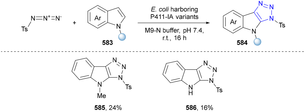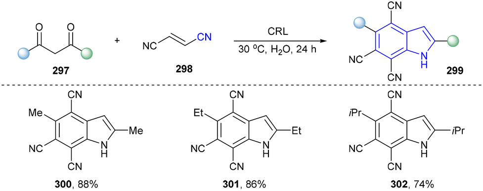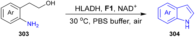 Overall, when compared to traditional synthetic methods that may require harsh conditions and metal catalysts, the enzymatic or chemoenzymatic synthesis of pyrroles can offer a more environmentally friendly and efficient alternative. There are also some enzymes catalysing the formation of pyrrole ring involved in the biosynthetic pathway of natural products,145 such as kosinostatin146 and coumermycin A1,147 but they will not be discussed here since they have not yet been applied for enzymatic synthesis. It is expected that they will provide more possibilities for the enzymatic synthesis of pyrroles in the future.