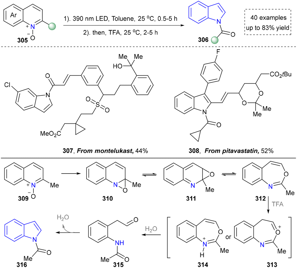 Indole represents a pivotal structural motif in organic synthesis,149 enabling diverse functional group transformations through a wide array of chemical reactions.150 Traditional methods include but are not limited to electrophilic halogenation, Friedel–Crafts acylation and alkylation, oxidation and reduction processes, as well as 1,2- and 1,4-addition reactions. The indole ring system is ubiquitously distributed in natural products, constituting one of the most prevalent heterocyclic frameworks in nature.151,152 Globally, >70 synthetic indole-containing drugs have been commercialized.153,154 Notably, the U.S. Food and Drug Administration (FDA) specifically approved 14 indole-derived pharmaceutical agents between 2015 and 2021, underscoring the continued importance of this heterocyclic system in modern drug discovery and development.155 In this section, the synthesis of indoles through emerging approaches will be overviewed carefully.