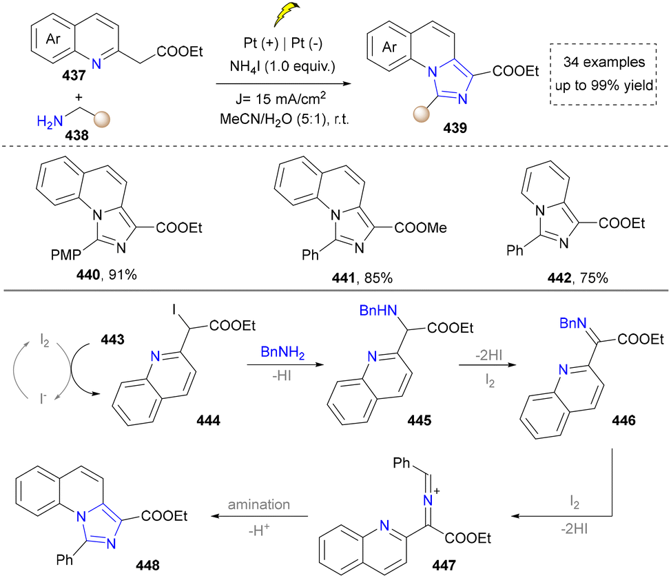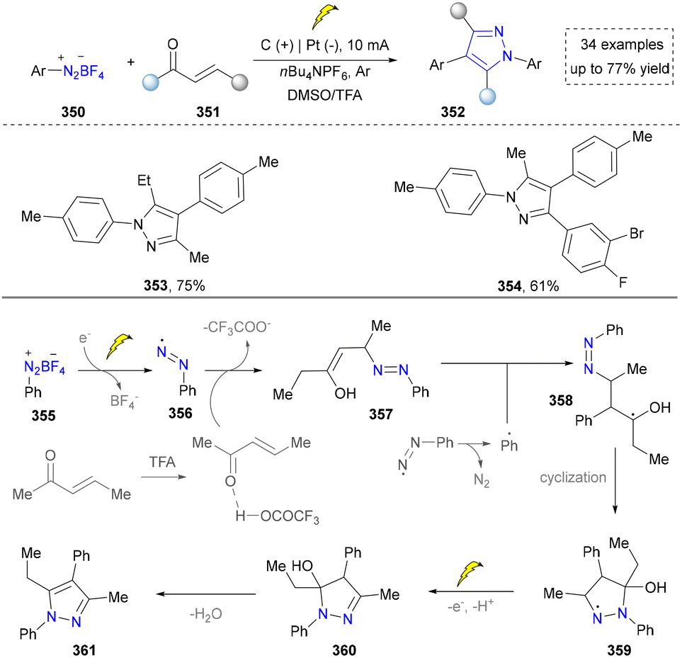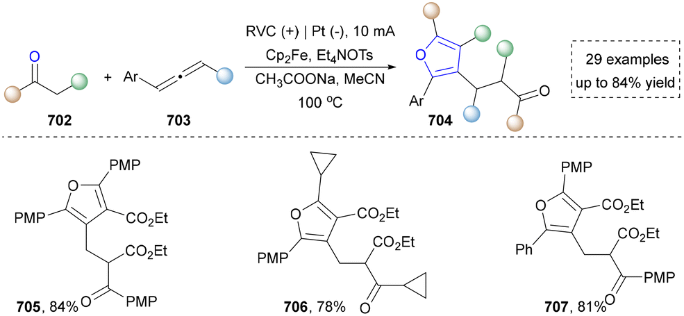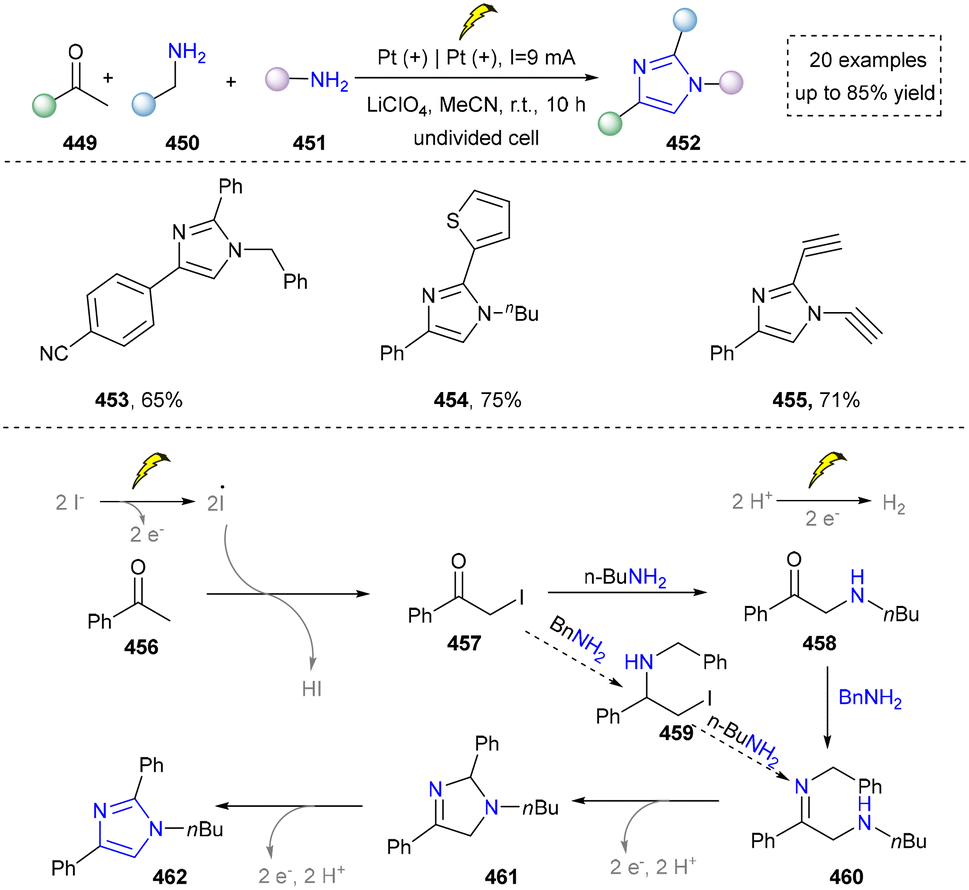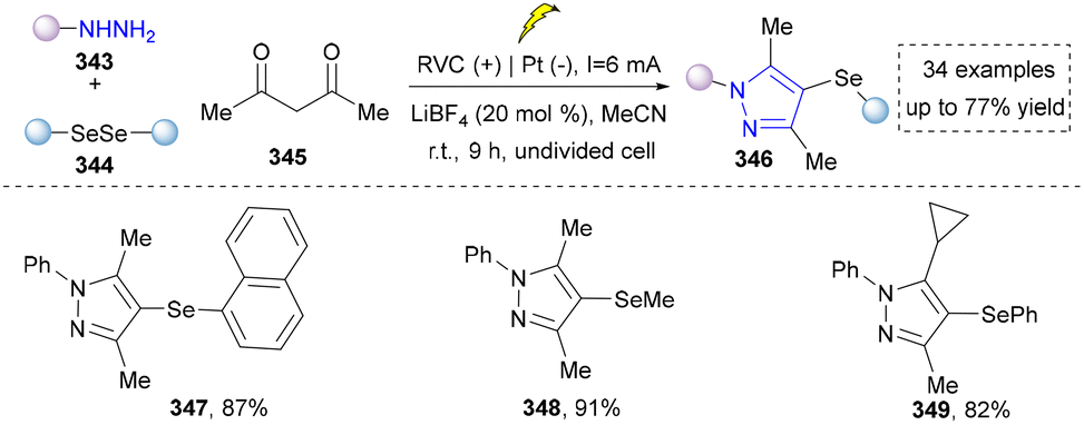 Afterwards, primary amines have been consistently proposed as starting materials for the electrochemical synthesis of pyrroles. In 2021, the Chen group reported the use of aniline with dimethyl acetylenedicarboxylate to obtain the final product through consecutive condensation, single-electron-transfer (SET), ring closure and subsequent proton-eliminating aromatisation.106 Subsequently, the Yuan group disclosed that acetyl acetone was activated by iodine to form β-enamino ketone as the key intermediate. This three-component strategy significantly improved the structural diversity of pyrrole and its derivatives.107