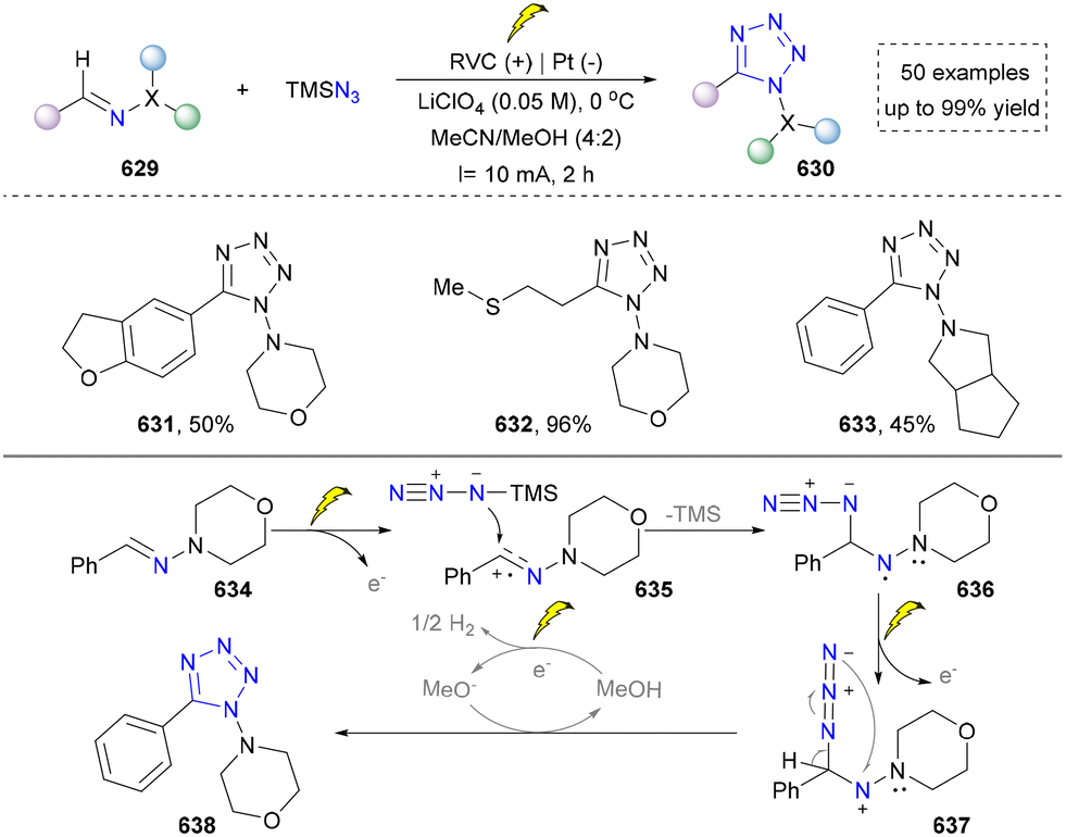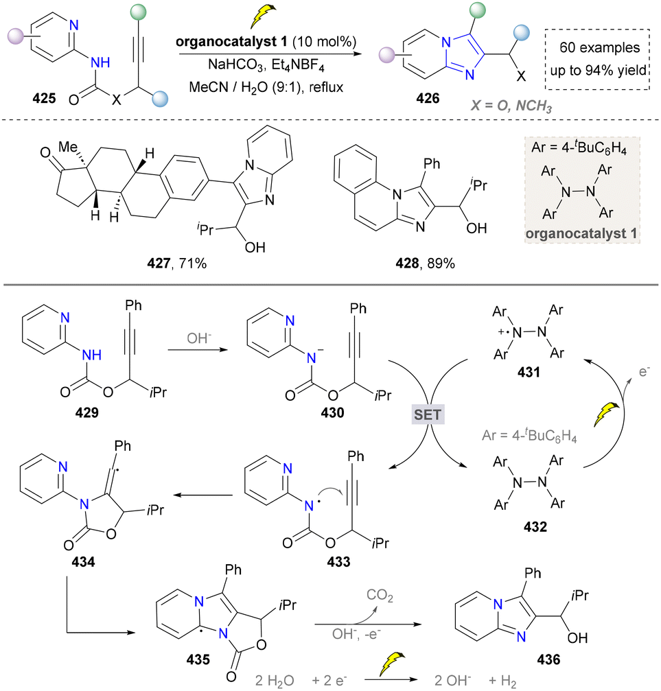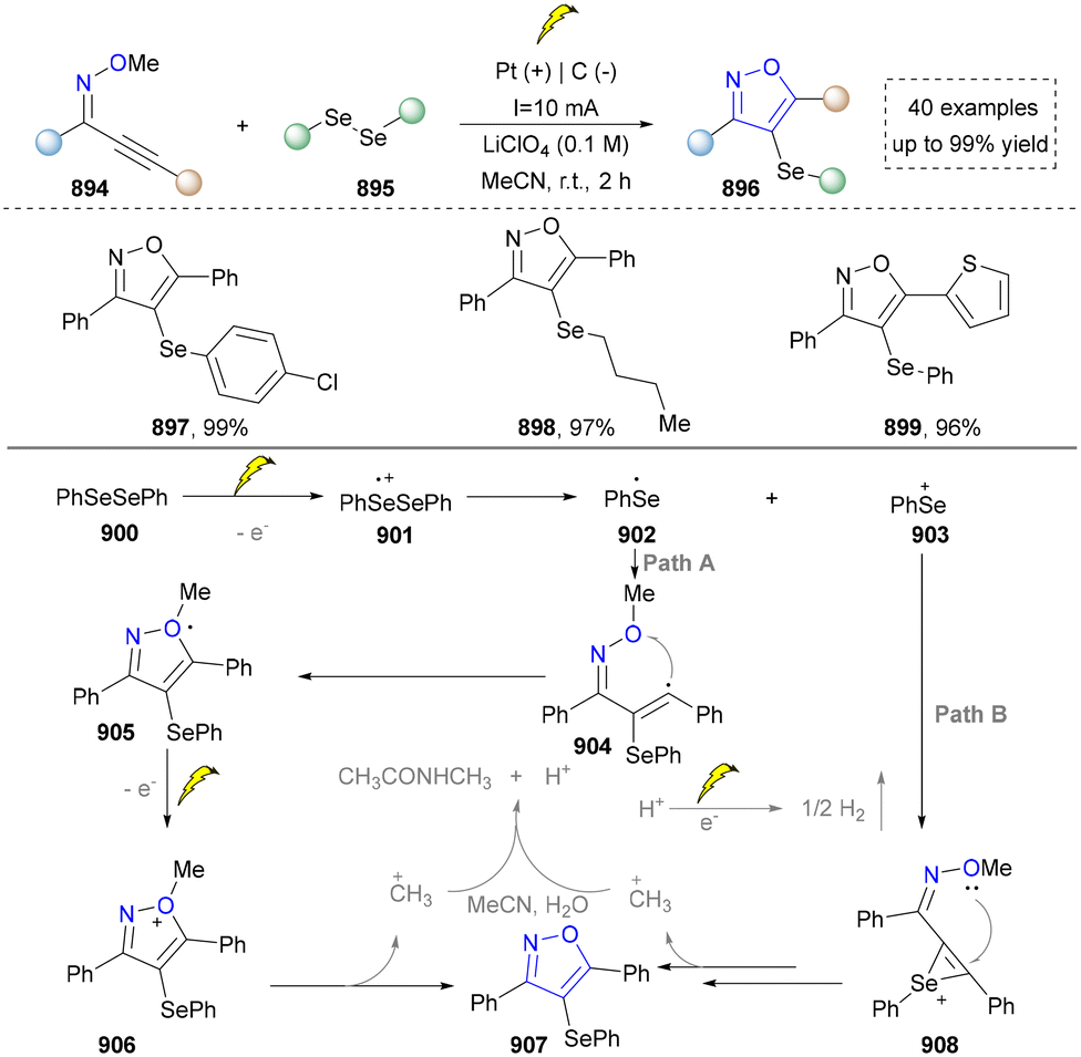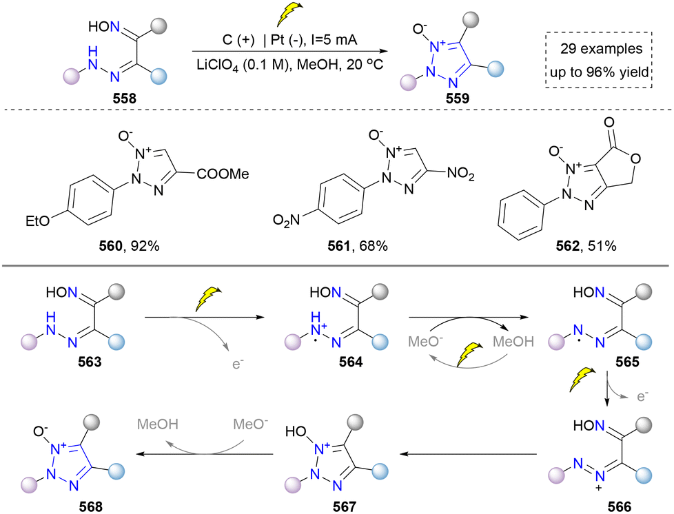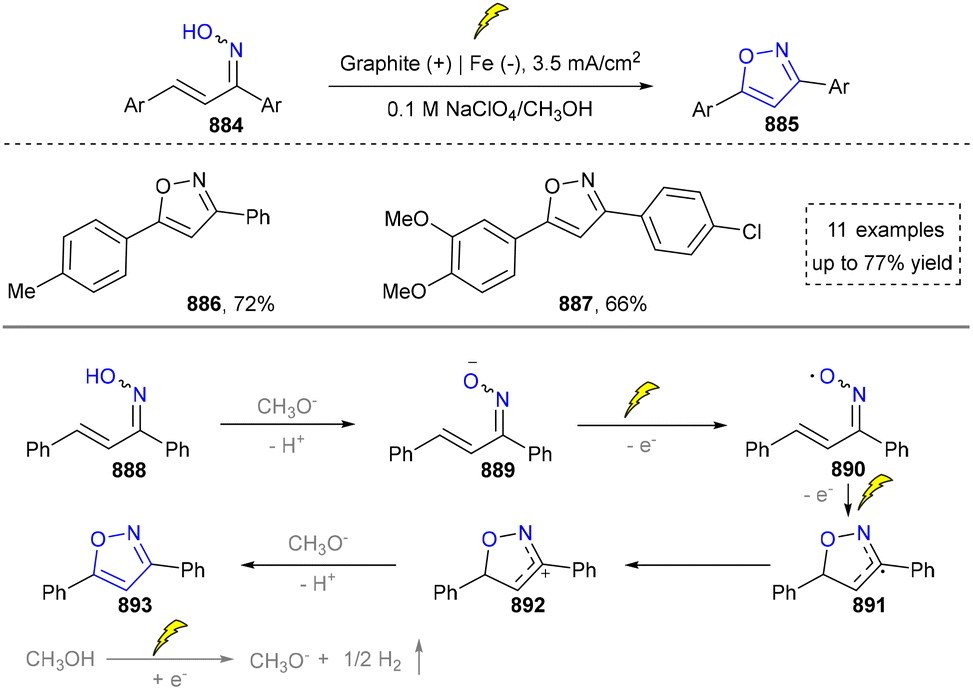 Afterwards, primary amines have been consistently proposed as starting materials for the electrochemical synthesis of pyrroles. In 2021, the Chen group reported the use of aniline with dimethyl acetylenedicarboxylate to obtain the final product through consecutive condensation, single-electron-transfer (SET), ring closure and subsequent proton-eliminating aromatisation.106 Subsequently, the Yuan group disclosed that acetyl acetone was activated by iodine to form β-enamino ketone as the key intermediate. This three-component strategy significantly improved the structural diversity of pyrrole and its derivatives.107