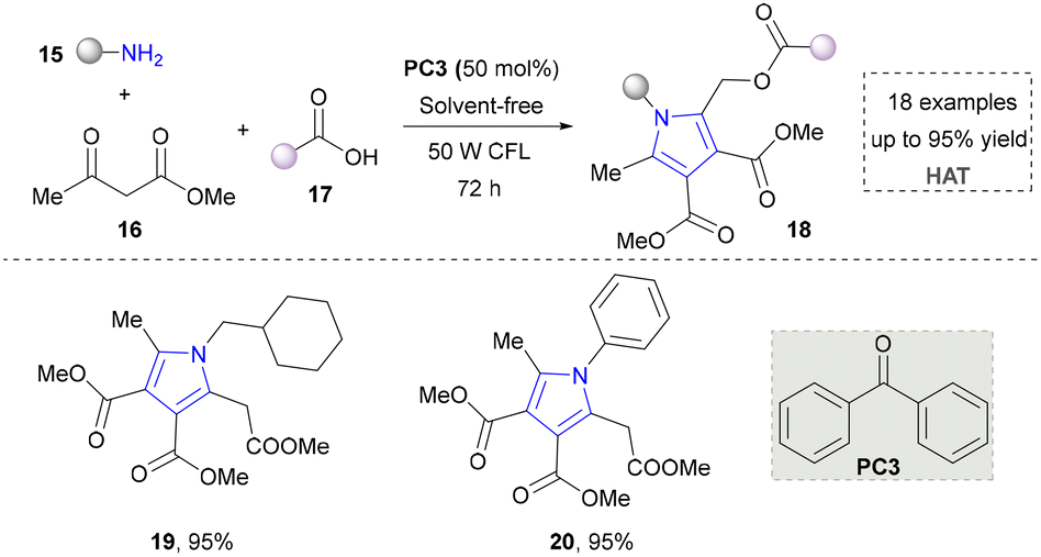 In an effort to further expand the structural diversity of pyrrole, a methodology for achieving highly substituted pyrroles using primary amines as the nitrogen source has been developed by Salles’ group in 2021 (Scheme 3).33 In this approach, a three-component reaction using various primary amines, carboxylic acids and ketones as synthetic synthons tremendously improved the structural diversity of pyrroles (19, 20). Moreover, the target product was obtained under solvent-free conditions, which also showed good sustainability. Although this method advanced the synthesis of highly substituted pyrroles, it required a long reaction time (72 h). In addition, the radical pathways in the proposed mechanism still need to be further verified, especially regarding the intermediate formation and conversion process.