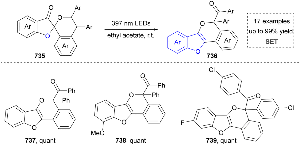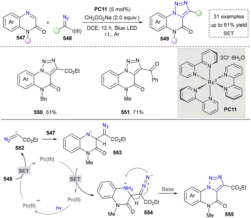 Building on Yoon's foundational work, other groups have also explored azides as 2H-aziridine precursors for the synthesis of polysubstituted pyrroles. In 2019, the Maurya group reported a visible-light-driven protocol by utilizing α-azidochalcones coupled with 1- or 2-naphthols or 2-hydroxy-1,4-naphthoquinones in the presence of a ruthenium-based photocatalyst, achieving the construction of highly functionalized 2,3-fused pyrroles through a radical-mediated strategy.98 In 2020, they further developed a catalyst-free strategy employing α-keto-vinyl azides to access structurally diverse pyrroles. This methodology demonstrated broad applicability to vinyl azides bearing a conjugated amino group.99