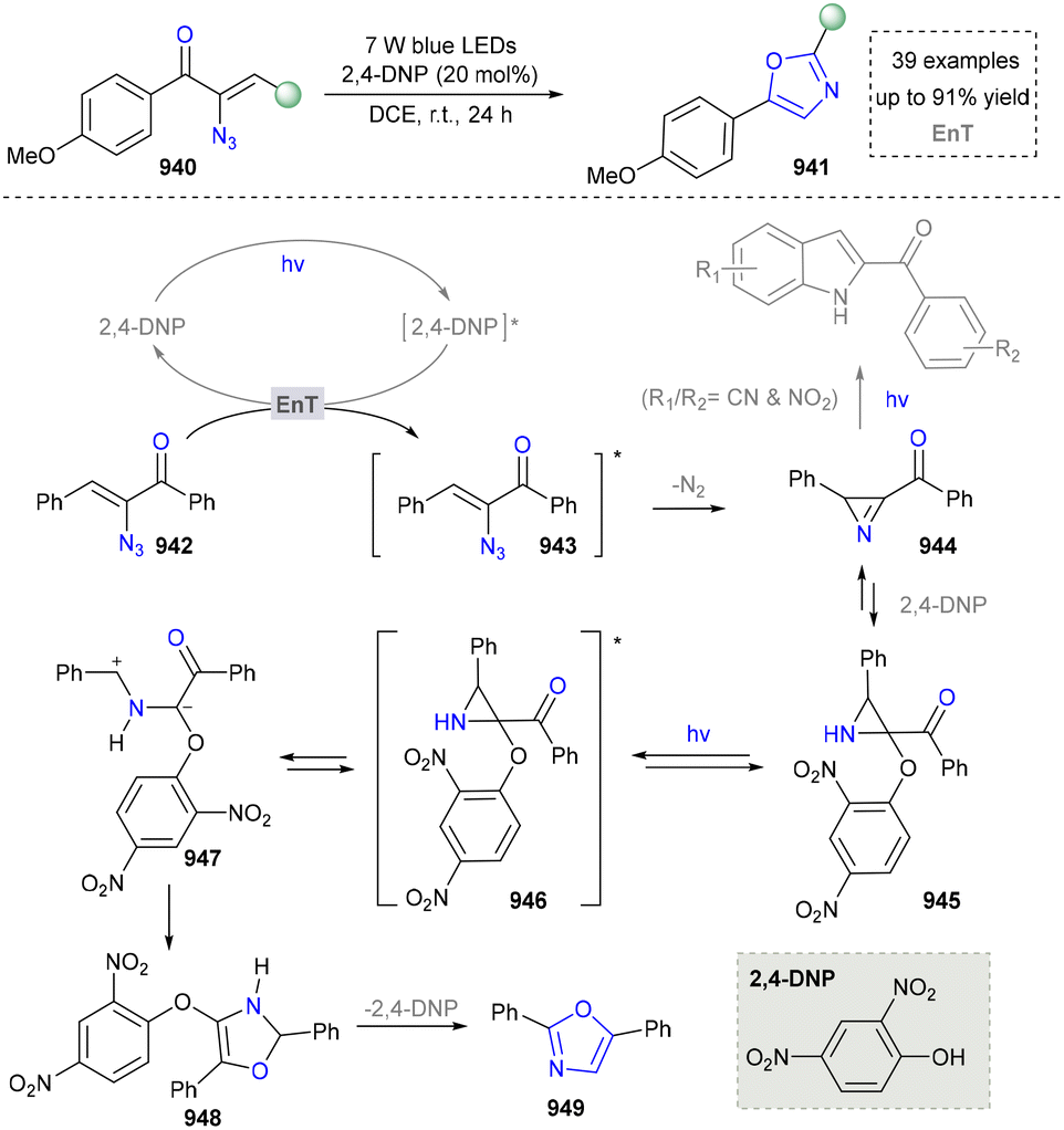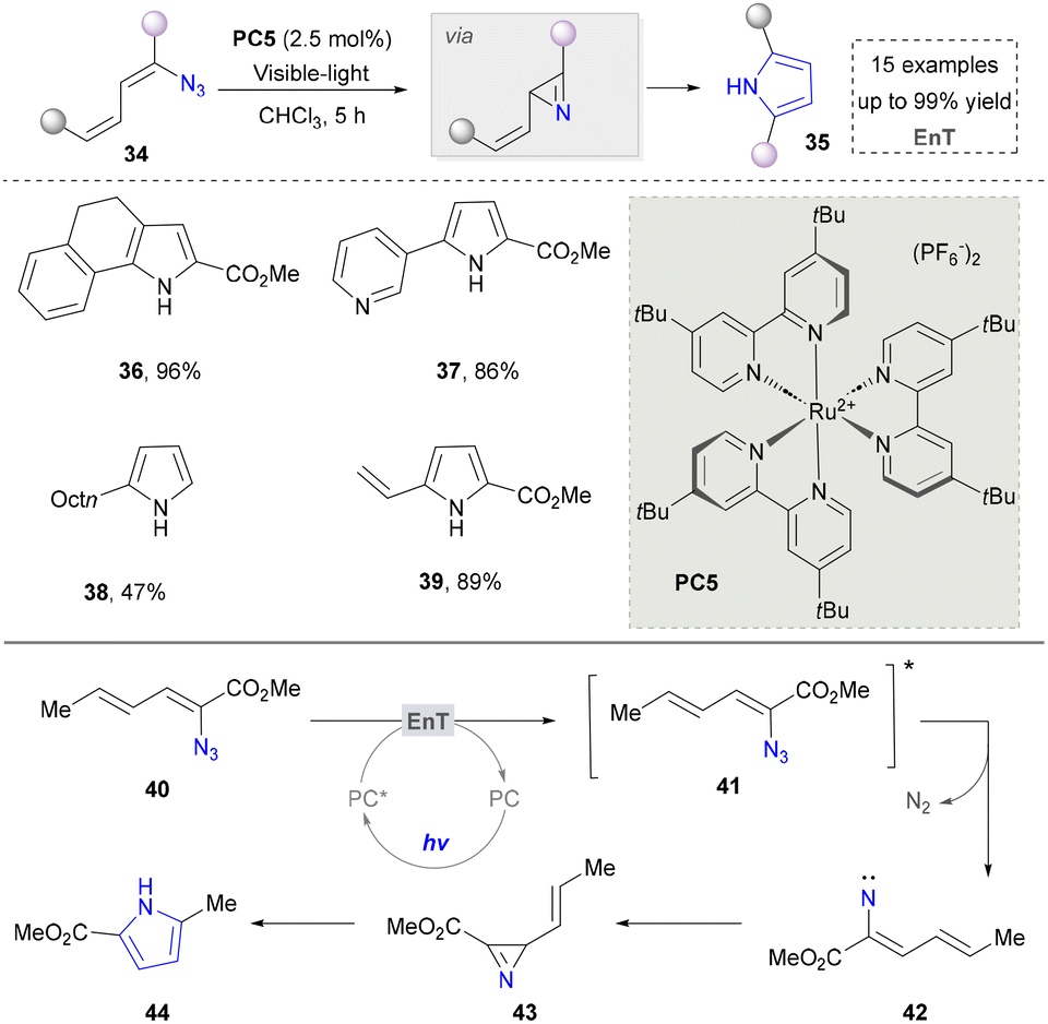 Besides using amines/enamines as nitrogen sources, azides have emerged as a crucial alternative reagent for pyrrole synthesis due to their unique denitrification ability, photosensitising activity, and versatile intermediate generation properties.94 In 2012, Yoon and co-workers found a photocatalytic method to activate aryl and vinyl azides directly, providing a convenient method for constructing pyrroles (Scheme 5, 36–39).95 The mechanism confirmed that the vinyl azides were activated via the energy transfer to form the triplet nitrene 42. This was followed by the cyclisation of the nitrogen compartment to produce a 2H-azepane intermediate, which was subsequently rearranged to form the pyrrole. It is well known that vinyl azides decompose into nitrile or 2H-azopropylline under heat and ultraviolet light and are widely used in the synthesis of various N-heterocyclic rings.96,97