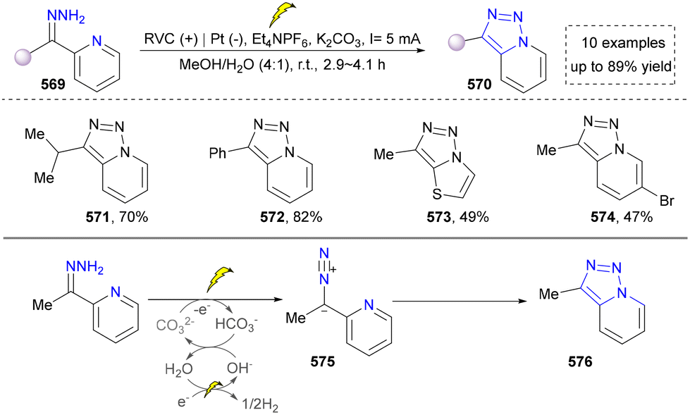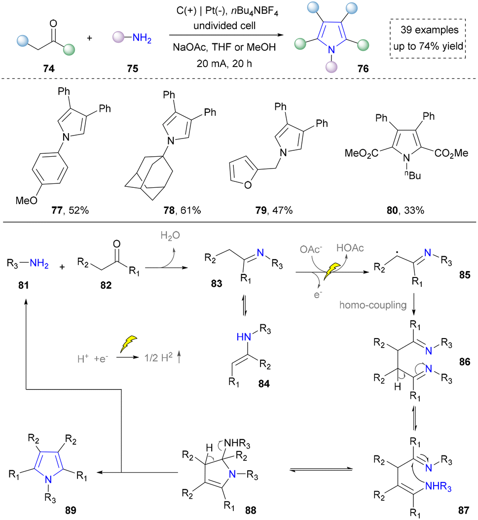 | | Scheme 8 Electrochemical oxidative annulation of amines and aldehydes/ketones for the synthesis of pyrroles. | |