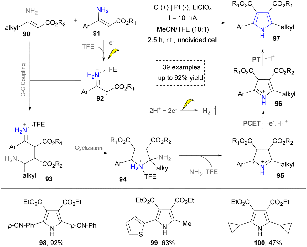 Building upon these foundations, the Sarkar group has developed an effective electrochemical strategy for the heterocoupling of aryl- and alkyl-substituted amines to synthesize tetrasubstituted aminopyrroles in 2021 (Scheme 9).31 His approach leveraged trifluoroethanol to finely tune electrochemical parameters, achieving desired chemoselectivity through the oxidative cross-coupling of two structurally distinct enamines to construct NH-pyrroles (98–100). The mechanism involved the following challenging steps: (1) oxidation of the aryl-substituted enamine 91 to generate radical intermediate 92; (2) coupling of 92 with the alkyl-substituted enamine 90 to form radical intermediate 93. Subsequently, cyclization and oxidative aromatization yield the targeted asymmetric pyrrole product 97. This metal-free methodology expands the substrate scope for pyrrole synthesis from systems traditionally dominated by aryl groups to aryl–alkyl hybrid systems, while exhibiting broad functional group tolerance, thereby offering a highly adaptable platform for constructing complex pyrrole building blocks in medicinal chemistry. On the basis of this work, some electrochemical methods have been reported by using different enamines as building blocks, which further diversified the pyrrole synthesis.34,108,109