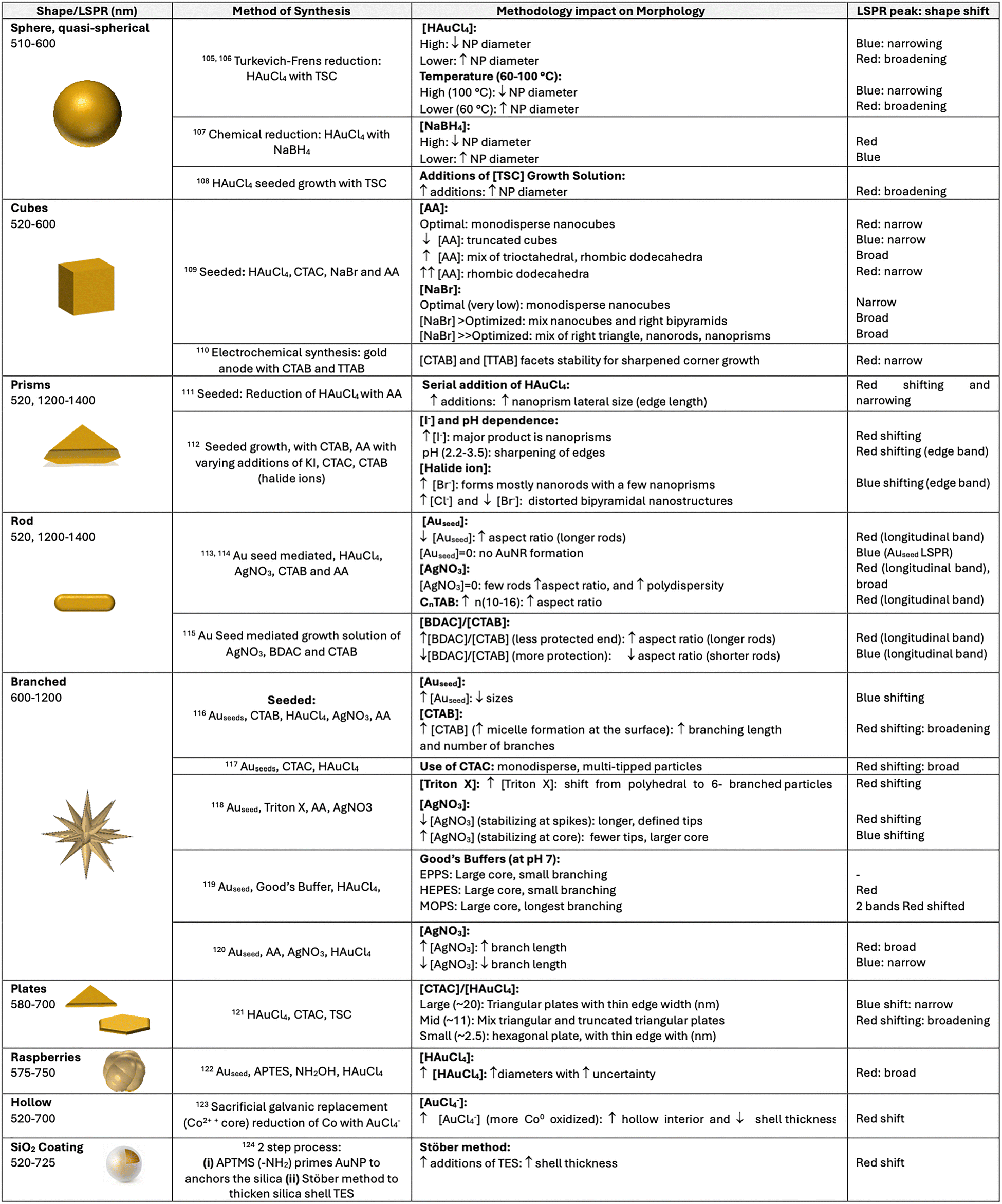 The design of plasmonic substrates for LSPR applications is central to enhancing performance. These techniques exploit electromagnetic field enhancements at “hot spots” regions of intensified local fields typically found at sharp tips, edges, poles, or interparticle junctions of metallic nanostructures. Precise control over nanoparticle morphology, composition, and spatial arrangement is essential for tailoring the optical response and thereby maximising signal amplification. According to eqn (4) the key factors influencing the LSPR of nanoparticles include: (i) material composition, (ii) local dielectric environment, and (iii) nanostructure morphology.