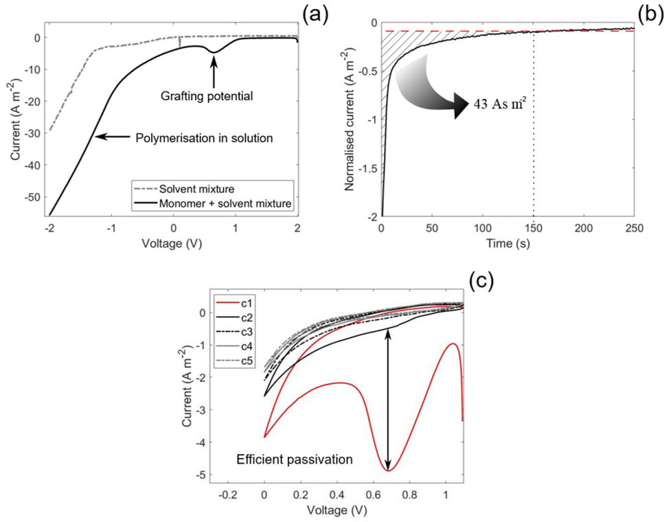 The passivation efficiency of the electrografting was evaluated by CVs where the voltage was swept across the grafting potential. The efficiency is indicated by the reduction of the grafting peak between cycles, where a larger reduction indicates a more efficient grafting. As can be seen in Fig. 2(c), the current of the grafting peak was reduced from −5 to −0.5 A m−2 by the second cycle and reached a value of 0 A m−2 by the third cycle. This indicates a highly efficient passivation of the CF surface.