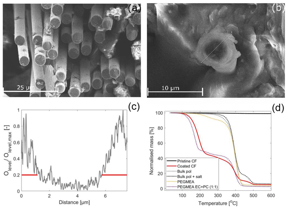 The TGA results show that mass loss in the coated CFs occurs in three distinct steps, see Fig. 3(d). For comparison, the TGA curves of pristine CFs, bulk polymer (with and without salt), the PEGMEA monomer, and a 1