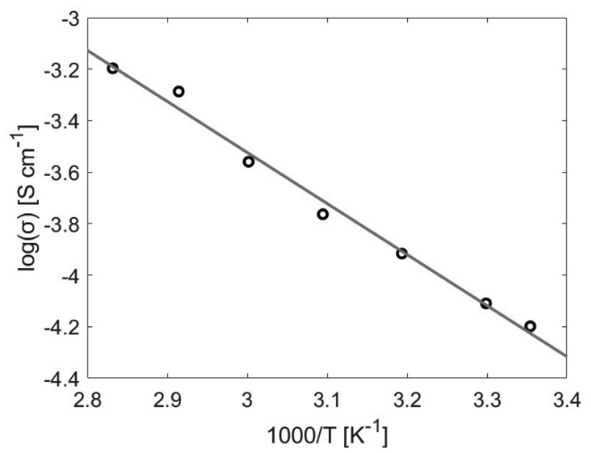 The conductivity for the bulk polymer shows Arrhenius-type behaviour and a linear increase with temperature, see Fig. 4. At room temperature, the ionic conductivity is σ = 6 × 10−5 S cm−1 and at the maximum temperature (80 °C) the conductivity is an order of magnitude larger (σ = 6 × 10−4 S cm−1). This agrees with values found in literature.7,36–38 The activation energy for the ion movement in the PEG is calculated from the Arrhenius equation and is found to be EA = 38 kJ mol−1.