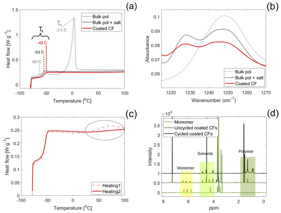 The DSC measurement showed a thermal event in the first heating cycle that was not present during the second heating cycle for both the coated CFs, Fig. 5(c), and the bulk polymer containing salt. This thermal event can be explained by a heat-initiated polymerisation of unreacted monomer in the SPE, causing the heat flux observed during the first heating cycle. Since the monomer reacts in the first cycle, a similar event is not observed in the second heating cycle. Interestingly, the same behaviour was not observed for the bulk sample without salt, Fig. S1, implying that the salt affects the polymerisation.
