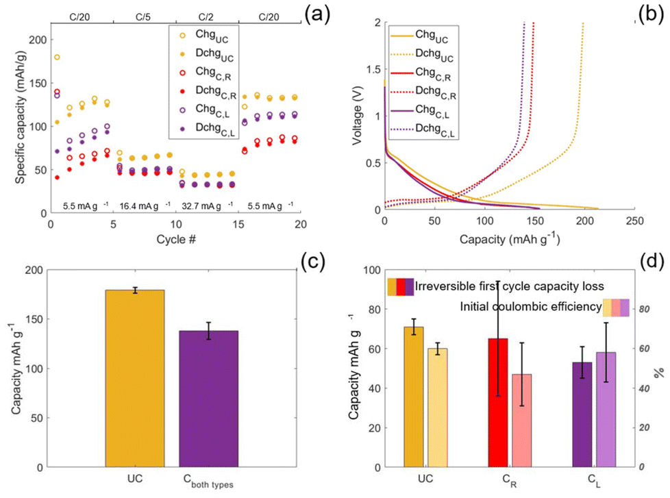 60 for both coated and the uncoated CFs. Since the capacity of the coated samples is lower for both the slope and plateau region by an equal amount, the difference in capacity can be explained by a loss of active mass during electrografting. During manufacturing, some fibres do not establish direct electrical contact with the current collector when the CF tow is attached. This is a direct consequence of manually dividing the as received 24K fibre tow into the ∼1.5K tow sample size used herein. Specifically, the manual division process displaces a fraction of the fibres below the attachment point to the current collector, preventing direct contact. As a result, these fibres are electrically connected to the current collector only indirectly, via contact with neighbouring fibres. This indirect electrical contact is nevertheless sufficient to enable electrochemical grafting and the initiation of a monolayer of monomer on the CF surface, because this initiation step occurs instantaneously.27 Once initiated, propagation proceeds as a purely chemical process and therefore continues even if the indirect electrical contact is subsequently lost. Consequently, SEM images (Fig. 3a and b) show a homogeneous coating across all fibres. However, coating of the SPE removes fibre–fibre contact points, which in turn eliminates the indirect electrical pathways to the current collector. This electrically isolates fibres that previously relied on indirect contact. Because electrically isolated fibres cannot participate in electrochemical cycling, this loss of connectivity directly results in a reduction of the electrochemically active mass. This explains why the specific capacity is lower for the coated samples even at very low specific currents.