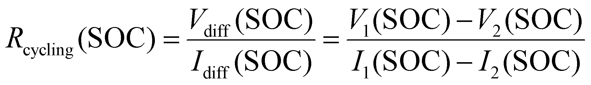 Resistance-related properties are investigated using the voltage relaxation at the end of (dis-)charge of the initial break-in cycles, pulse resistance measurements conducted as part of the RPT and the voltage difference between charge and discharge processes with different current rates. The latter is used to calculate a resistance which we refer to as cycling resistance Rcycling(SOC) as opposed to pulse resistance throughout this publication. This resistance is a function of the SOC. It is calculated according to eqn (1). Where Vdiff(SOC) and Idiff(SOC) represent the difference between the voltage and current at any given SOC, respectively. In this work V1 and I1 refer to the voltage and current from the C/2 cycle while V2 and I2 represent voltage and current during the C/20 cycle. Fig. S28 in the SI provides a graphical illustration. This resistance includes processes with time constants substantially higher than 10 s and thus differs from the pulse resistance.
