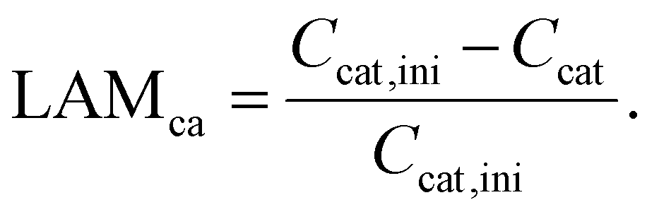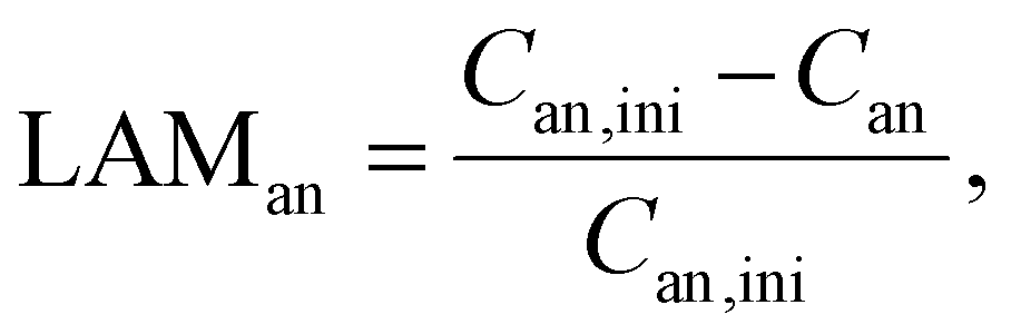 Interestingly, despite the high variance in capacity decline, cells ① and ② show similar LAMca as shown in Fig. 8(a). Cell ③ shows a similar trend, but exhibits a more pronounced increase in LAMca compared to the other cells. In contrast, the LAMan of these three cells varies strongly, whereas cell ③ shows more than twice the LAMan of cell ①. Despite this high variance in LAMan, the LAMca of all cells is considerably higher than the LAMan at EOT. This behavior is in contrast to LIBs, where the anode usually shows a higher LAM than the cathode for both anodes using pure graphite102,103 and silicon containing anodes16,40,41 under most test conditions.