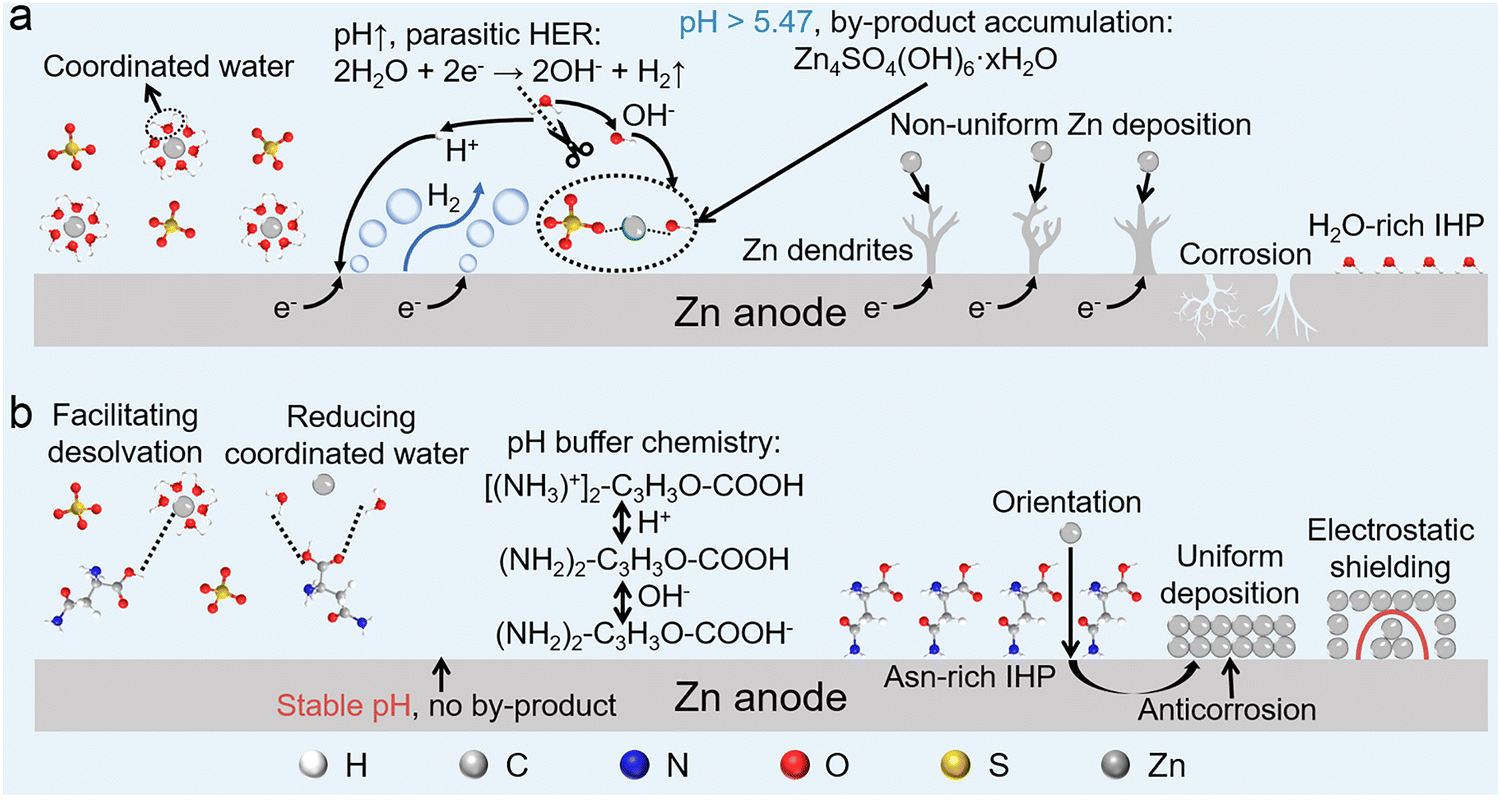 Amino acids are organic compounds containing elements such as C, H, N, and O, and exhibit characteristics of both cyclic (indole and imidazole rings) and straight-chain structures. They are commonly found in nature or can be easily obtained from commercial sources. Herein, a multifunctional bioorganic molecule, zwitterionic amino acid asparaginate (Asn) with multiple zincophilic sites, was used to explore the relationship between the molecular structure and its function in AZMBs. The acid–base functional groups contained in Asn dynamically regulate the pH of the electrolyte, avoiding the generation of ZSH by-products and inhibiting the HER. Additionally, experiments and theoretical calculations demonstrated that the interaction between H2O and Zn ions was effectively weakened, and the amount of H2O in the initial solvation structures of Zn ions was reduced through multiple zincophilic sites in Asn, improving the desolvation kinetics. Furthermore, because of its preferential adsorption, Asn adsorbed onto the Zn anode via functional groups. Similar to the principle of wind prevention and sand fixation by planting shelterbelts, Asn adsorbed on the anode surface can prevent further erosion by reconstructing the EDL. In addition, through a competitive adsorption mechanism and electrostatic shielding effect, Asn induces uniform Zn deposition to inhibit the formation of Zn dendrites (Fig. 1). Benefiting from the synergistic effect caused in the bulk electrolyte and electrode/electrolyte interface, Zn||Zn symmetric batteries within Asn additive achieve highly stable and reversible Zn plating/stripping of 5700 h and an ultra-high cycle life of over 1000 h even with an extremely high depth of discharge (DOD) of 85%. Moreover, the modified electrolyte enables Zn||MnO2 batteries and Zn||AC capacitors to deliver superior cycling stability and rate performance. The design principle applied in this study opens up a new way to realize high-performance AZMBs and promote their commercial applications. Overall, this study outlines transferable selection principles, including zwitterionic backbone, balanced coordination, and strong hydrogen bonding, which support the wide applicability of a class of biomolecule-based additives and guide practical ZMB systems.