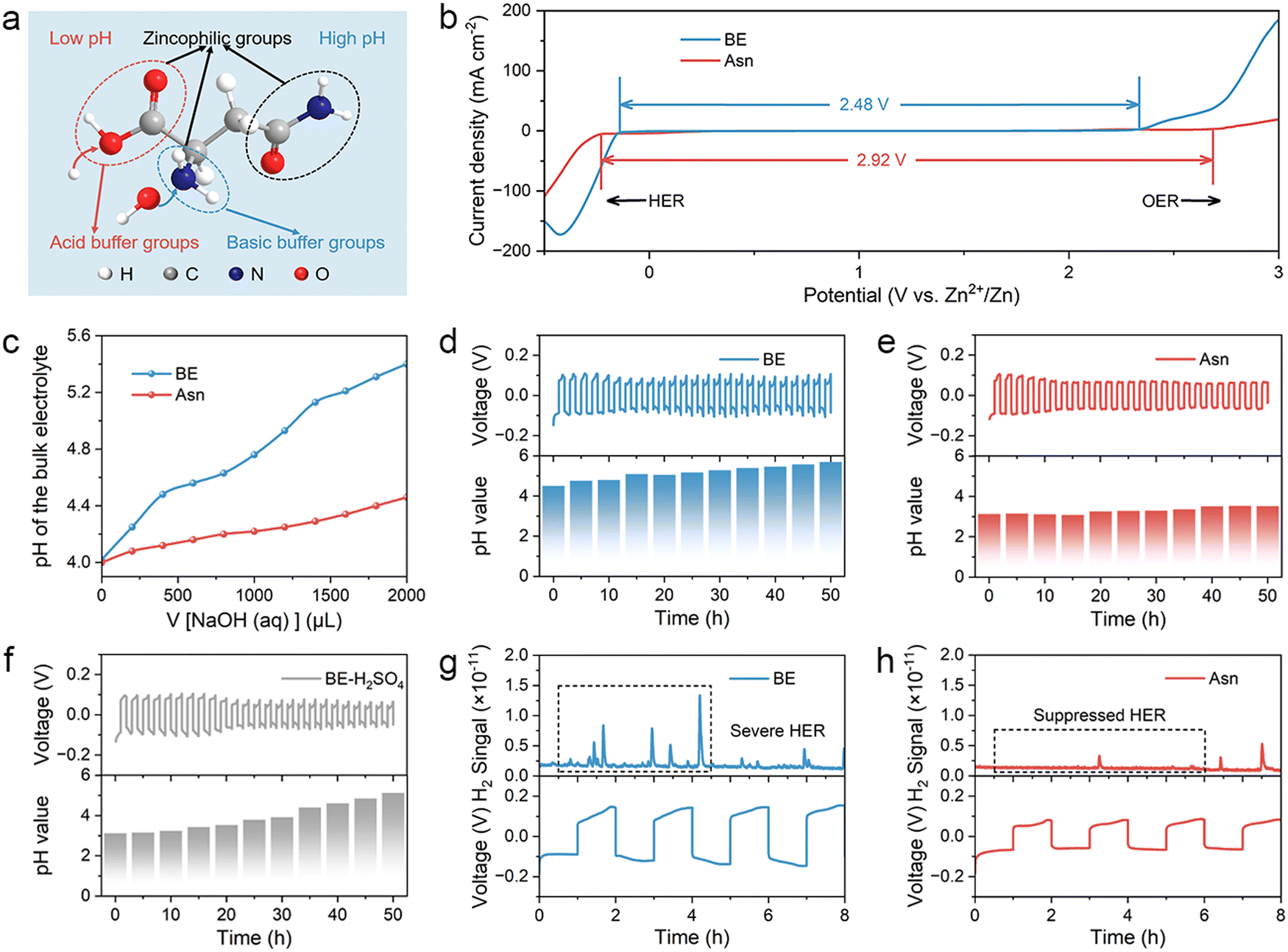 To further explore the positive pH buffering effect of Asn in the bulk electrolyte, in situ pH monitoring was carried out during the Zn plating/stripping process of Zn||Zn symmetric batteries upon cycling at 5 mA cm−2. The pH value of BE gradually increased from 4.3 to 5.8 after 50 h, indicating serious HER (Fig. 2(d)). However, the Asn additive can alleviate the increase in pH and finally stabilize the pH value at 3.5 (Fig. 2(e)). Since this pH value is lower than the isoelectric point of Asn, it indicates that Asn was protonated in the electrolyte and existed in the form of Asn cations enriched within the compact double layer, thereby reducing interfacial proton activity, partially blocking H+-formation sites, and increasing the desolvation/Volmer-step barrier. Then, we make the initial pH value of BE the same as that of the Asn electrolyte by adding a dilute sulfuric acid solution. After cycling under the same conditions for 50 h, the pH value of BE + H2SO4 was still higher than that of the Asn electrolyte (Fig. 2(f)). In addition, according to the SEM images and optical photographs of Zn metal after immersion in different electrolytes for one month, it is demonstrated that simply lowering the initial pH value of the electrolyte can not inhibit the HER and further lead to anode corrosion (Fig. S3). This phenomenon suggests that the amphoteric Asn additive acts not only as a favorable pH buffer but also as an interfacial regulator in aqueous electrolytes. In the H2O-splitting pathway, the carboxylate groups of Asn scavenge HER-generated OH−, restraining bulk and interfacial alkalization and suppressing the precipitation of Zn4SO4(OH)6·xH2O (ZSH). Meanwhile, the amino groups can receive excess H+ at a low pH. In situ differential electrochemical mass spectrometry (DEMS) was adopted to dynamically monitor the HER process in symmetric batteries.39 For BE, obvious H2 signals were observed during battery operation, indicating that the corrosion reaction is self-generated and intensifies during the charge/discharge process (Fig. 2(g)). Remarkably, the symmetric batteries with Asn electrolyte showed obviously suppressed H2 signals throughout the process, indicating the positive role of Asn in suppressing the HER (Fig. 2(h)).
