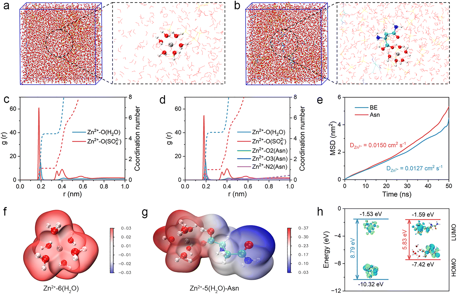 We subsequently investigated the diffusion coefficient of Zn ions in different electrolytes using the results calculated from the mean square displacement (MSD). As shown in Fig. 3(e), compared with BE, Zn ion exhibits a stronger diffusion ability in the Asn electrolyte due to a more reasonable solvation structure, indicating the effectiveness of the Asn additive in reshaping the solvation structures of Zn ions. The electrostatic potential (ESP) mapping distribution was carried out to investigate the intrinsic driving force for the formation of different solvation structures (Fig. 3(f) and (g)). Asn is found to reduce the ESP distribution of [Zn(H2O)6]2+. This trend is attributed to the abundant coordination sites provided by Asn (–COOH and –NH2), which disrupt the hydrogen bond networks of H2O, promote the desolvation of [Zn(H2O)6]2+, and facile Zn2+ transport. The atomic charge was further used to reveal the electron transfer among the solvation structures of the Zn ions. As shown in Fig. S8, the atomic charge of Zn in [Zn(H2O)6]2+ is +0.505, which is owing to electron transfer from water molecules to the Zn ion. For the [(Zn(H2O)5Asn)]2+ structure, Asn entered the solvation structures of Zn ions through competitive coordination, reducing the number of water molecules with a high shielding effect in the first solvation shell of Zn ions, which causes a higher atomic charge of Zn. The introduction of Asn leads to an increase in the atomic charge of Zn, which is a crucial microscopic characteristic for the successful regulation of solvation structures. A higher atomic charge of Zn implies a stronger interaction between Zn and the O atoms in the remaining coordinated water molecules, which weakens the polarization of the O–H bonds, making them less likely to break down and form H2. Subsequently, DFT calculations were conducted to determine the energy levels of the lowest unoccupied molecular orbital (LUMO) and highest occupied molecular orbital (HOMO) for Asn. The results reveal a narrower LUMO–HOMO energy gap for Asn compared to H2O, indicating enhanced chemical reactivity (Fig. 3(h)). Specifically, the LUMO energy level of Asn (−1.59 eV) is lower than that of H2O (−1.53 eV), suggesting a greater propensity for electron acceptance by Asn. This characteristic facilitates electrochemical decomposition and promotes SEI formation.