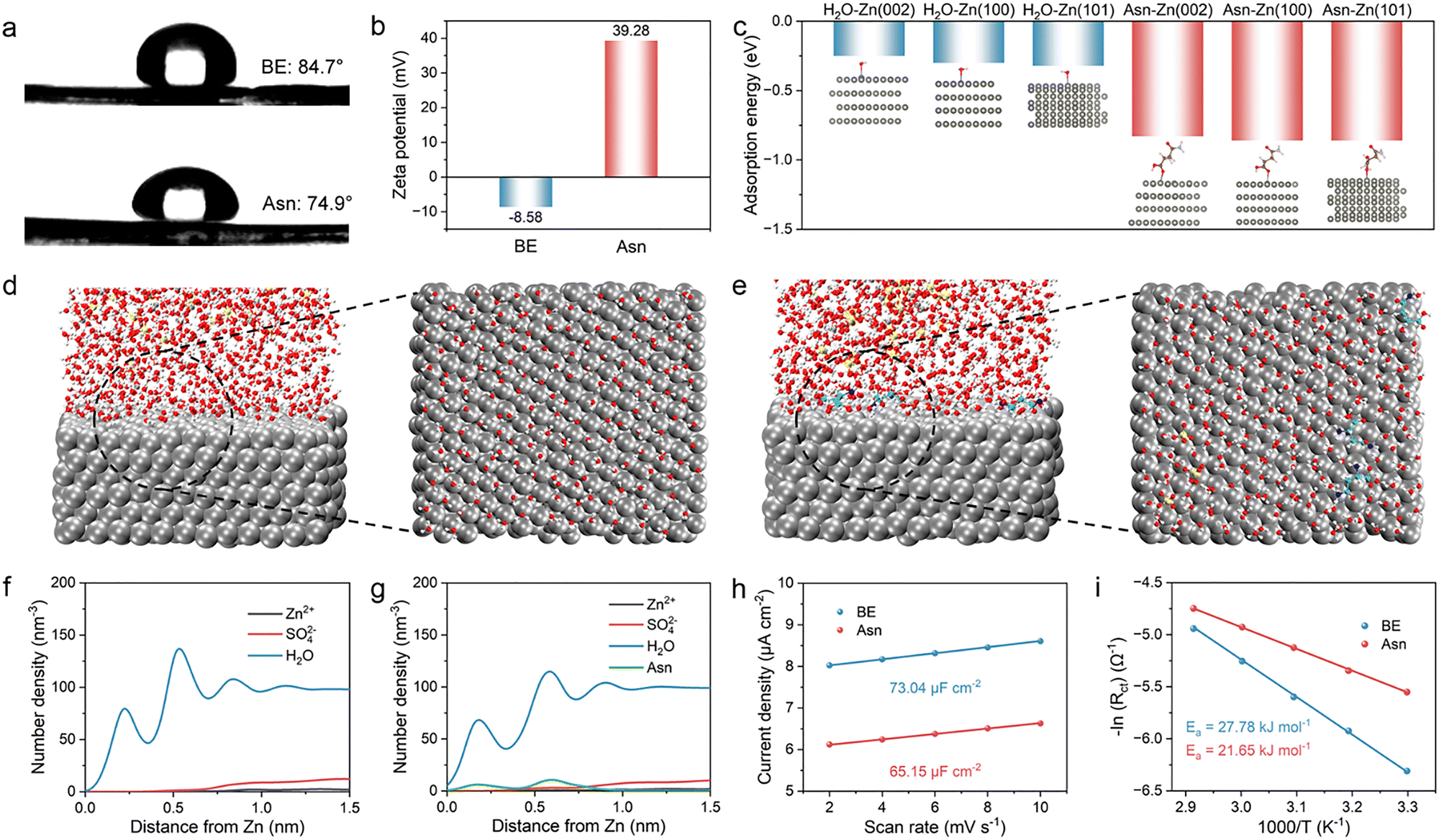 The Asn additive in the solvated coordination is preferentially adsorbed on the Zn anode, enriching the EDL by strong electrostatic adsorption between the positively charged sites in Asn and the negatively charged anode surface under the electric field. Thus, we systematically explored the impact of Asn on the EDL. First, a contact angle experiment was performed to examine the wettability of the two electrolytes on the Zn anode. As shown in Fig. 4(a), the angle decreases from 84.7° to 74.9° after introducing Asn. Enhanced wettability is verified according to the decreased droplet surface tension on the macroscopic scale, which originates from the reduction in surface energy due to the adsorption of Asn. Additionally, zeta potential measurements of the Zn powders were employed to reveal the interaction between Asn and the surface of the Zn anode. The test results show that the potential values positively shift from −8.58 to 39.28 mV after the addition of Asn, which suggests the spontaneous absorption of Asn with strong zincophilic properties on the Zn surface, further contributing to the Zn surface charge regulation via the strong electrostatic interaction (Fig. 4(b)). The positive shift in the zeta potential also reveals that Asn is ionized in the electrolyte to generate the Asn cation. Simultaneously, the positive shift in the zeta potential also suggests that the generated Asn cations are prone to regulate the surface charge field via the rearrangement of molecules and ions on the surface of the Zn anode, further excluding the active water molecules from the IHP.