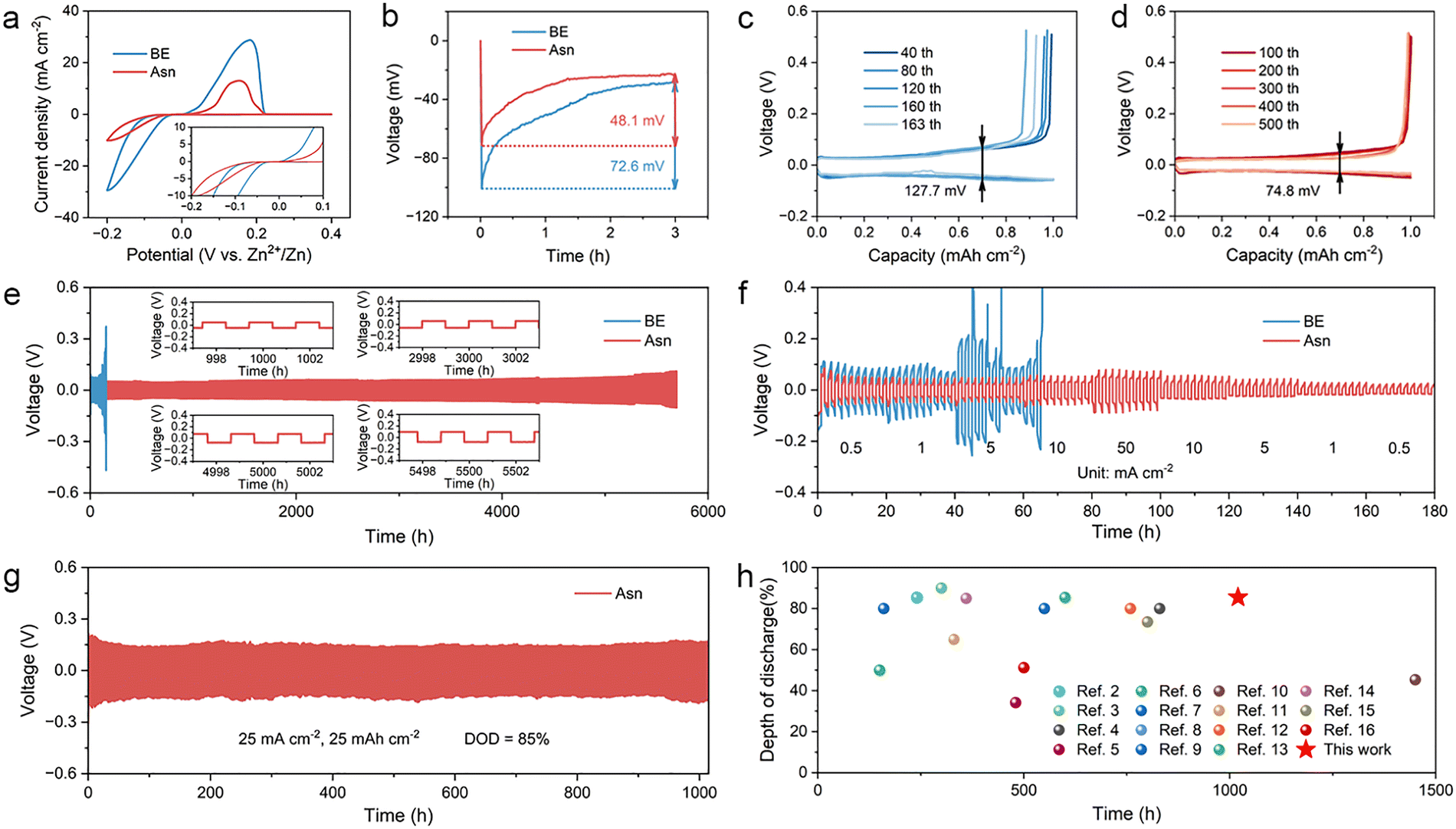 Zn||Zn symmetric batteries were assembled to evaluate the cycling stability of Zn anodes with different electrolytes through long-term galvanostatic charge/discharge (GCD) measurements. Under routine test conditions of 1 mA cm−2 and 1 mA h cm−2, the Asn guaranteed stable Zn plating/stripping of 5700 hours (near 8 months) without an obvious increase in the voltage polarization throughout the whole operating process, which is almost 37 times longer than that of the battery with BE (Fig. 5(e)). Subsequently, the improvement by Asn was investigated in the rate performance of Zn||Zn symmetric batteries with different electrolytes at various current densities ranging from 0.5 to 50 mA cm−2 for 10 cycles under each condition. As illustrated in Fig. 5(f), the voltage profile of the Asn-based battery displays a steady and regular variation with varied current densities and a stable operation even at 50 mA cm−2. Conversely, the battery using BE encountered dramatic voltage fluctuation as the current density increased from 1 mA cm−2 to 5 mA cm−2. In addition, to further explore the limit of Zn plating/stripping and the possibility of practical application, Zn||Zn symmetric batteries with Asn electrolyte were tested under an extreme condition of high depth of discharge (DOD) to evaluate the utilization efficiency of the Zn anodes with a thickness of 50 µm (Fig. 5(g)). Testing at such a high DOD directly interrogates Zn utilization and exposes the failure modes, dendrite-induced shorting, shape evolution/voiding, passivation by basic salts, and parasitic hydrogen evolution, which typically accelerate when most of the active Zn is repeatedly stripped and replated. Surprisingly, even running at 25 mA cm−2 and 25 mA h cm−2 with a rigorous DOD of 85%, the batteries still maintain stable cycling and an ultralong lifespan of 1000 h, which is superior to most of the previously reported work (Fig. 5(h)). The results confirm that Asn in the electrolyte not only enhances cycling stability but also ensures durability at high rates and areal capacities.