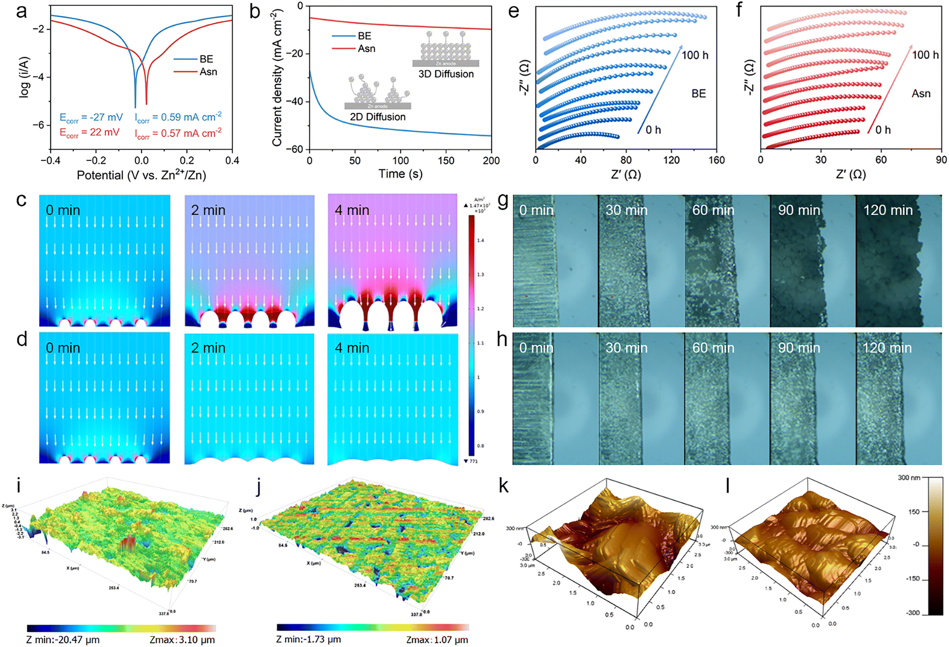 According to the above studies, the surface adsorption of Asn displays multiple pivotal roles. To further investigate the protective effect of the Asn additive, a series of anti-corrosion performance evaluations and related characteristic tests were conducted. The corrosion resistance towards different electrolytes is depicted in Fig. 6(a). Obviously, compared to the electrolyte without Asn, the corrosion potential of Zn with the Asn-modified electrolyte increased from −27 to 22 mV, reflecting a reduced tendency towards corrosion. Furthermore, the Asn additive reduced the corrosion current density from 0.587 mA cm−2 to 0.574 mA cm−2, indicating a retardant corrosion rate. Chronoamperometry (CA) is further performed to investigate the Zn deposition behavior and nucleation mechanism by applying an overpotential of −150 mV (Fig. 6(b)). For BE, the current density continuously decreases within 200 s, indicating a rampant 2D diffusion process and inhomogeneous Zn deposition. During the plating process, Zn ions tend to accumulate at the anode surface, and the exposed area decreases, leading to the accumulation of Zn ions on the tips to form dendrites. Interestingly, for the Asn electrolyte, the current density decreases rapidly within 50 s, demonstrating a rapid 2D diffusion process. Then, the current density tends to stabilize due to the electrostatic shielding effect of the Asn additive, which restrains the plane diffusion of Zn ions in the 2D range. This may be attributed to the fact that surface-absorbed Asn suppresses the growth of Zn dendrites and facilitates the formation of a uniform Zn surface. In addition, this result was further verified by finite element method (FEM) simulation, which is adopted to describe the distribution of the electric field and Zn dendrite growth during the electroplating process. In the case of BE, the current density at the tip of the protrusions is higher than that at other locations due to the tip charge accumulation effect (Fig. 6(c) and Fig. S16a). Consequently, a large number of Zn ions quickly aggregate at the protruding tip, while a weak signal of Zn ions can be observed at adjacent flat areas (the bottom of the protrusion). In contrast, the electric field at the tip of the protrusions is significantly suppressed through the adsorption of Asn and displays a more uniform distribution in the non-tip region due to electrostatic shielding (Fig. 6(d) and Fig. S16b). With the thermodynamically stable Zn anode in the Asn-modified electrolyte, the Zn ion transport kinetics of the anode/electrolyte interface were synchronously boosted. This conclusion was derived from the results of the in situ EIS technique. Here, in situ EIS related to the impedance spectra collection of Zn||Zn symmetric batteries after continuous Zn plating/stripping was carried out. When cycling in the BE, the passivation of the Zn anode becomes serious with the generation of Zn4SO4(OH)6·xH2O (ZSH), resulting in a continuous increase in the interface impedance (Fig. 6(e)). Conversely, the interface impedance of the Asn Asn-modified anode/electrolyte interface remained stable after a drastic reduction, indicating greatly enhanced interface transport kinetics (Fig. 6(f)). Therefore, a highly uniform distribution of Zn ions is achieved in the Asn electrolyte, effectively suppressing the growth of Zn dendrites.