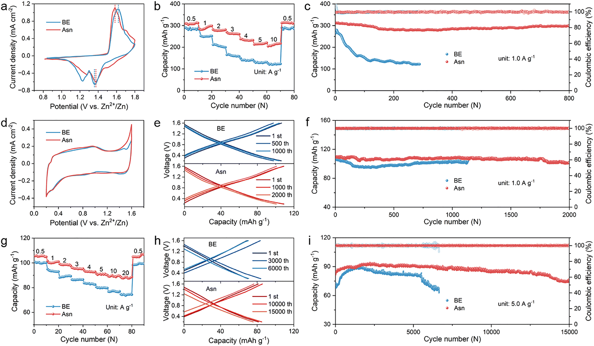 To certify the universality of the designed Asn electrolyte in other electrochemical energy storage devices, Zn ion capacitors (ZICs) were fabricated by coupling the Zn metal anode with the AC cathode. As shown in Fig. 7(d), typical quasi-rectangular-shaped CV curves can be observed for ZICs with different electrolytes, revealing the highly reversible physical adsorption/desorption process of electrolyte ions on the AC cathode. Higher peak current density and larger electrochemically active area demonstrate greater electrochemical reactivity with better reversibility and faster reaction kinetics in the Asn electrolyte. The semicircles of the EIS spectra in the high-frequency region demonstrated that the Asn electrolyte is more conducive to enabling rapid charge transfer than the BE electrolyte. Besides, the slope in the low-frequency regions is inversely proportional to ion diffusion resistance. The Asn electrolyte enables a lower ion diffusion resistance than the BE electrolyte. The lower initial impedance of Asn compared with BE also confirmed the faster reaction kinetics in the ZICs (Fig. S31). The overlap comparison of galvanostatic charge/discharge curves based on different electrolytes at 1 A g−1 is shown in Fig. 7(e), confirming that the ZICs with Asn exhibited a specific capacity of 108.84 mA h g−1, whereas their counterpart with BE achieved only a specific capacity of 102.88 mA h g−1. The corresponding cycling performance obviously revealed both higher specific capacity and much better cycling stability after 2000 cycles due to the advantages of Asn (Fig. 7(f)). Then, the rate performance of the assembled ZICs with different electrolytes was measured. As shown in Fig. 7(g), the ZICs with Asn harvest a superior rate capability under various current densities from 0.5 to 20 A g−1, and a capacity of 108 mA h g−1 can be recovered as the current density is set back to 0.5 A g−1, indicating high reversibility of the supercapacitor with Asn. Besides, 43.5% of the initial capacity can be obtained as the current density further increases to 5 A g−1. Moreover, the charge/discharge curves and the corresponding cycling performance at a higher current density of 5 A g−1 are consistent with the above results (Fig. 7(h) and (i)). As expected, the ZICs with Asn maintained a stable specific capacity of 82 mA h g−1 with a capacity retention of 97.10% over 15 000 cycles. In contrast, the BE ZICs showed a sharp decay in capacity only after 6000 cycles, facilitating the faster reaction kinetics with the utilized Asn. These results further demonstrate that the addition of Asn can significantly improve cycling performance and inhibit side reactions during operation. The excellent electrochemical performance in the Zn–MnO2 batteries and Zn-AC capacitors verifies the significance of the Asn additive in achieving high reversible capacities and a long lifespan.