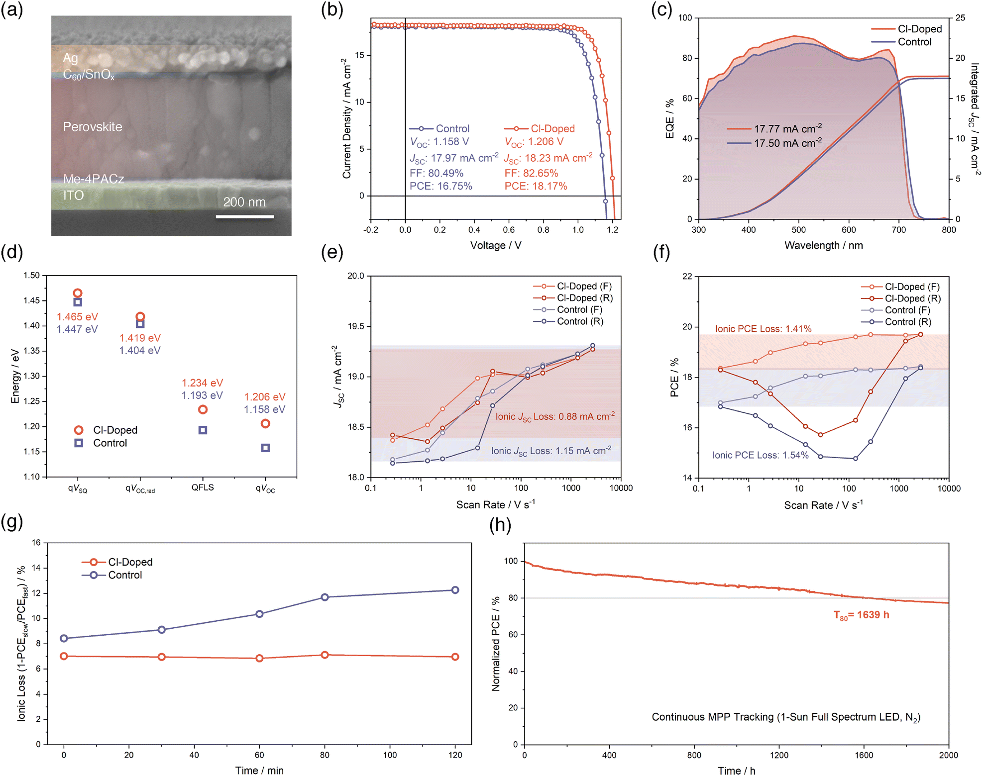 Furthermore, as shown in Fig. 3h, we tracked the long-term stability of a Cl-doped unencapsulated single-junction wide-bandgap PSC, which continuously operated at its maximum power point under 1-sun full spectrum (350–900 nm) white LED illumination in a N2-filled glovebox. The temperature of the device is not actively controlled and can be up to 45 °C. Under such an environment, the Cl-doped PSC can maintain 80% of its initial PCE for as long as 1639 hours (T80). This outstanding performance enabled by Cl-doping is among the best stabilities achieved so far for PSCs with a wide bandgap of 1.75 eV.