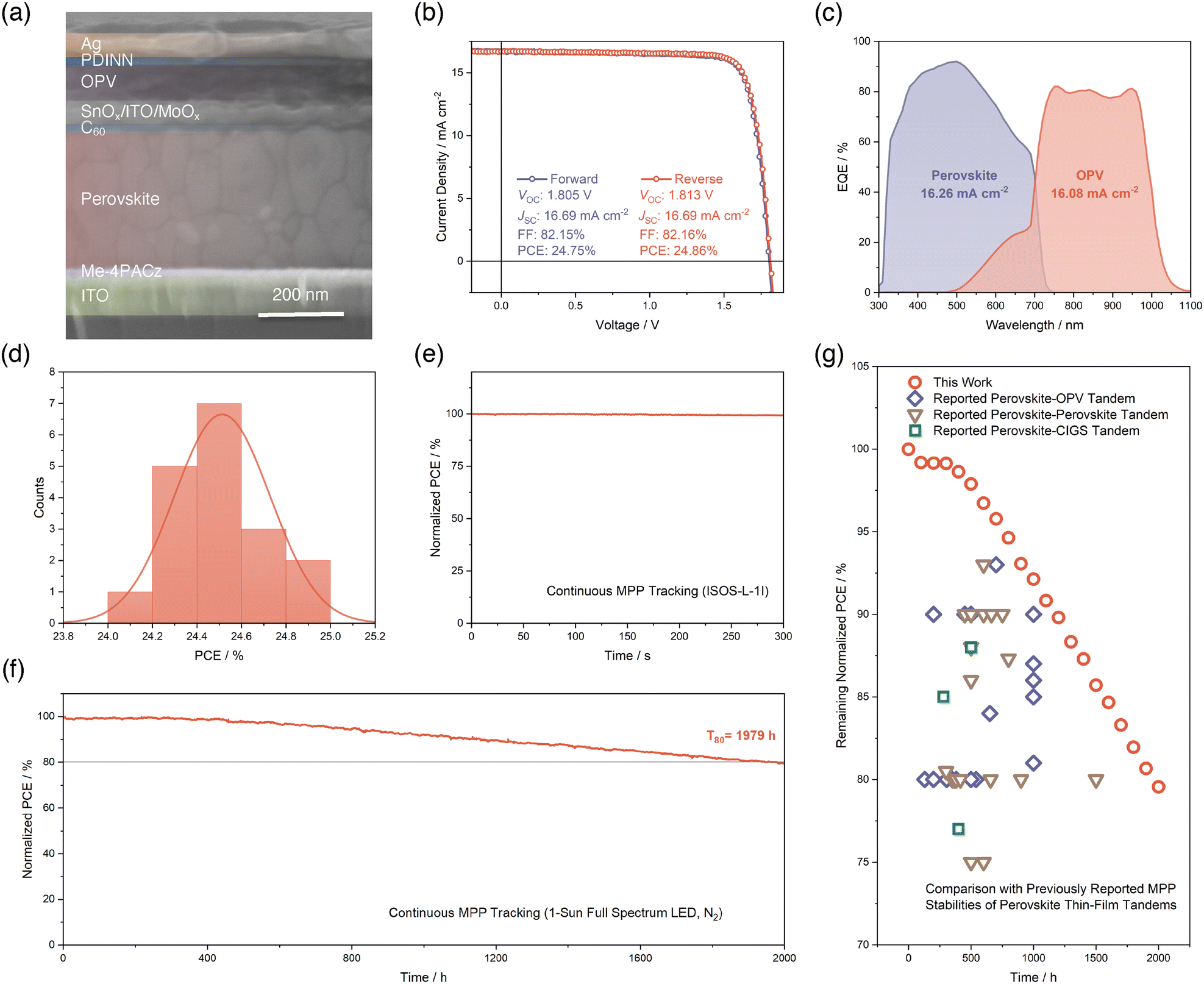 To comprehensively disclose the stability of our fabricated perovskite–OPV PSCs, we initially begin with a short-term MPP tracking of the TSC in a N2-filled glovebox and at a room temperature of 25 °C under 1-sun simulated air mass 1.5 global (AM1.5G) light illumination, following the ISOS-L-1I protocol.53 As depicted in Fig. 4e, within the 300 seconds of continuous tracking, we did not find any signs of noteworthy PCE degradation of our perovskite–OPV TSC. Furthermore, when shifted to long-term MPP stability assessment in a N2-filled glovebox with an actual temperature of ∼45 °C under 1-sun full spectrum (350–900 nm with UV) white LED light illumination, our TSC device manifests an outstanding performance where the T80 lifespan can be as long as 1979 hours (Fig. 4f). To the best of our knowledge, this operational stability lifetime is the best among all of the reported perovskite–OPV TSCs. What's more, we also elevated the testing temperature to 65 °C and applied active temperature control to maintain such a high temperature, in accordance with ISOS-L-2I protocol.53 This is the first time that a perovskite–OPV TSC has been subjected to such a high aging temperature continuously. This strict thermal stress, together with UV-containing illumination, poses a challenge for the durability of our TSC device. However, under such harsh conditions, the T80 lifetime for our perovskite–OPV TSC can still reach 195 hours, as illustrated in Fig. S20 (SI). Finally, in Fig. 4g, we summarized previous reports of MPP stability of perovskite–OPV TSCs, and included perovskite–perovskite and perovskite–copper indium gallium selenide (CIGS) TSCs to complete a comparison of our result with dual-junction perovskite-based thin-film TSCs. The plot shows the remaining PCEs versus time elapsed of different TSCs at different testing conditions (Table S2, SI). We also include our MPP stability result as red circles with a time interval of 100 hours from Fig. 4f in the same plot for ease of comparison. It can be clearly seen that our perovskite–OPV TSC based on Cl-doping exhibits remarkable MPP stability, outcompeting previously reported stabilities of perovskite–OPV and perovskite–perovskite TSCs. This observation suggests the stability benefits gained by applying our Cl-doping strategy to evaporated wide-bandgap perovskite and significantly advances the device MPP stability beyond the previous reports of dual-junction perovskite-based TSCs in literature, paving the way towards further development and commercialization of such kind of TSCs.