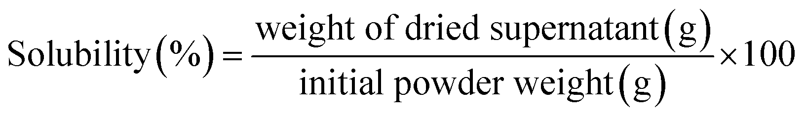 An aliquot of 20–25 mL of the supernatant was transferred to a pre-weighed glass Petri dish and dried either at 70 °C overnight or at 105 °C for 5 h until constant weight. The solubility index (%) was calculated as the ratio of the dry weight of solids recovered after drying to the initial weight of powder used, according to eqn (3).