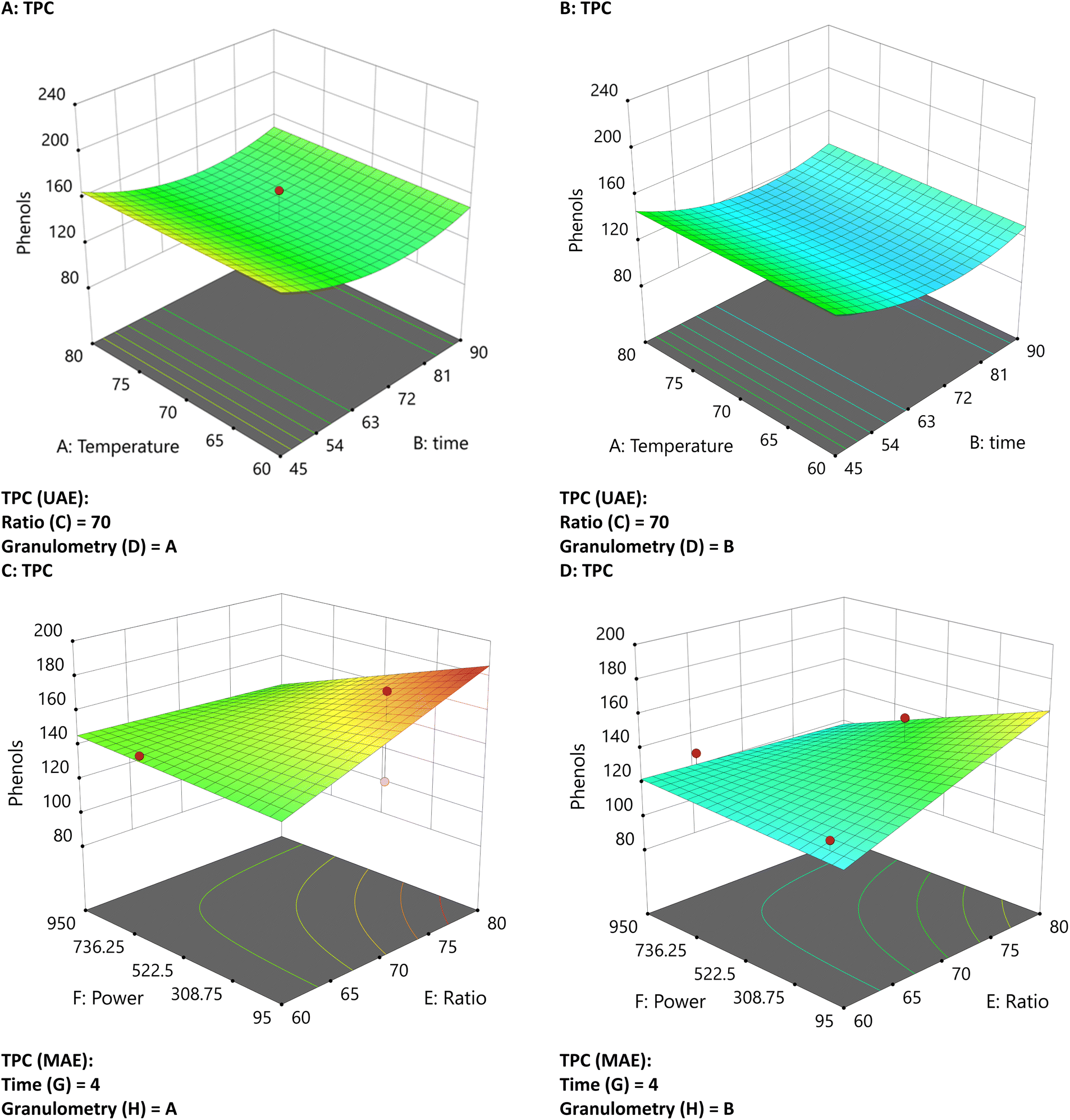 The TPC graphs show that MAE-assisted extraction yields higher extraction at higher ratios, with a significant effect of particle size (Fig. 2C). Granulometry is a significant factor influencing extraction concentration in the UAE (Fig. 2A and B). Additionally, increased time reduces the extraction of TPC from samples with larger particles.