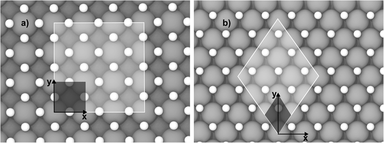 All H/metal surfaces were modelled as periodically repeated slabs consisting of six layers, of which the two lowest layers remained fixed in the geometry optimisation. The forces have been minimised until the convergence criterion of 10−3 eV Å−1 was met. For the primitive p(1 × 1)H/metal cells, we placed two hydrogen atoms on the bridge site in the case of the (100) surface, and one hydrogen on the three-fold hollow site for the (110) surface, which yields a hydrogen coverage, Θ, of 1 ML. The structures are represented by the black, opaque areas in Fig. 1. For the primitive cells used in the geometry optimisation, the Brillouin zone was sampled by a 36 × 36 × 1 k-point mesh. Lower coverages for the H/metal(110) surfaces were realised by placing one hydrogen on n-supercells. To ensure the same k-grid density throughout the different n × n × 1 supercells, we divided the k-point mesh by the factor of n.