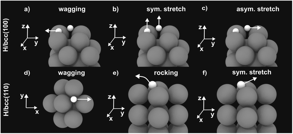 Both p(1 × 1)H/Mo(100) and p(1 × 1)H/W(100) have an in-plane wagging mode, an out-of-plane symmetric stretch mode, and an in-plane asymmetric stretch mode.67,68,72,73 For both systems, the in-plane wagging mode is the lowest-energy mode, followed by the out-of-plane mode, while the planar asymmetric stretch mode is the highest energetic mode.36,72–74 The hydrogen vibrations in both the p(1 × 1)H/Mo(110) and p(1 × 1)H/W(110) structures can be characterised as a planar wagging mode with no normal component, a rocking mode, and a symmetric stretch mode.40,41 The vibrations are displayed in Fig. 2. The corresponding computed frequencies of these modes are in good agreement with experimental EELS data (Table 1).