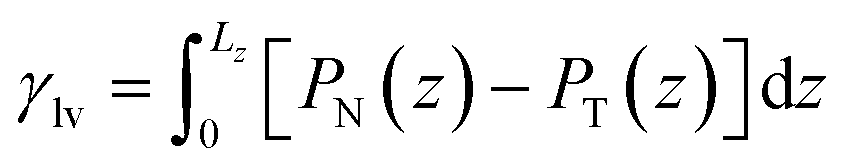 For a given channel height H, the magnitude of Pcap is therefore controlled by the liquid–vapour surface tension and the liquid–graphite contact angle. Both the contact angle (θ) and the liquid–vapour surface tension (γlv) were obtained directly from molecular simulations. The contact angle was determined from separate droplet simulations for each electrolyte and concentration. An equilibrated cylindrical droplet was initially placed above a four-layer graphite slab and allowed to spread spontaneously on the surface. After equilibration, the droplet profile was averaged over time and fitted to a circular arc, from which the macroscopic contact angle θ was extracted and reported in Tables 1 and 2. Specifically, the 10 m and 16 m LiTFSI solutions both exhibited complete wetting on the graphite surface, which is recorded as θ = 0.0° in Table 1. The liquid–vapour surface tension γlv was calculated using the Kirkwood–Buff mechanical route from planar liquid–vapour interface simulations.22,46,67–70 For each electrolyte and concentration, a slab of liquid was placed in equilibrium with its vapour under periodic boundary conditions, and the surface tension γlv is calculated by the equation: