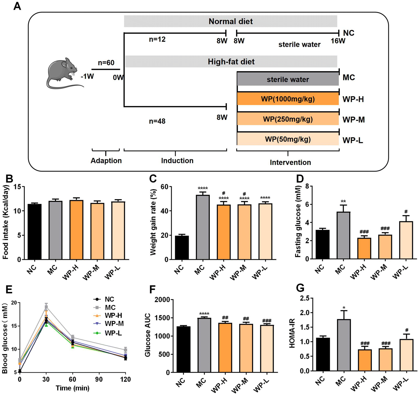 To investigate the antihyperglycemic effects of WP, mice were subjected to 8 weeks of high-fat diet (HFD) induction followed by low- (50 mg kg−1), medium- (250 mg kg−1), or high-dose (1000 mg kg−1) WP intervention (experimental design: Fig. 1A). Analysis of energy intake and body weight gain revealed no significant differences in cumulative caloric consumption among the groups (Fig. 1B). However, HFD-fed model control (MC) mice exhibited significantly higher weight gain versus normal chow controls (NCs) (Fig. 1C, p < 0.0001). Medium- and high-dose WP intervention significantly attenuated this weight gain (p < 0.05) without altering energy intake.