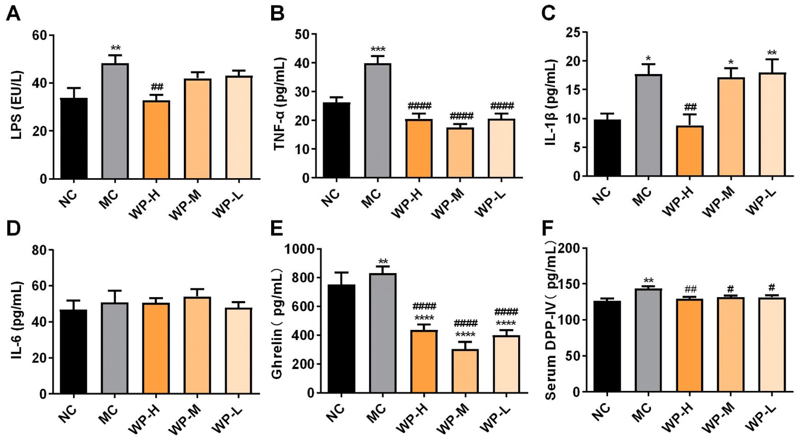 | | Fig. 3 WP attenuate HFD-induced low-grade inflammation and regulate hormonal and DPP-IV activity. Serum levels of (A) LPS, (B) TNF-α, (C) IL-1β, (D) IL-6, (E) ghrelin, and (F) DPP-IV. Data are shown as mean ± SD, n = 8. Significance levels: *p < 0.05, **p < 0.01, and ****p < 0.0001 vs. NC; #p < 0.05, ##p < 0.01, and ####p < 0.0001 vs. MC. | |
