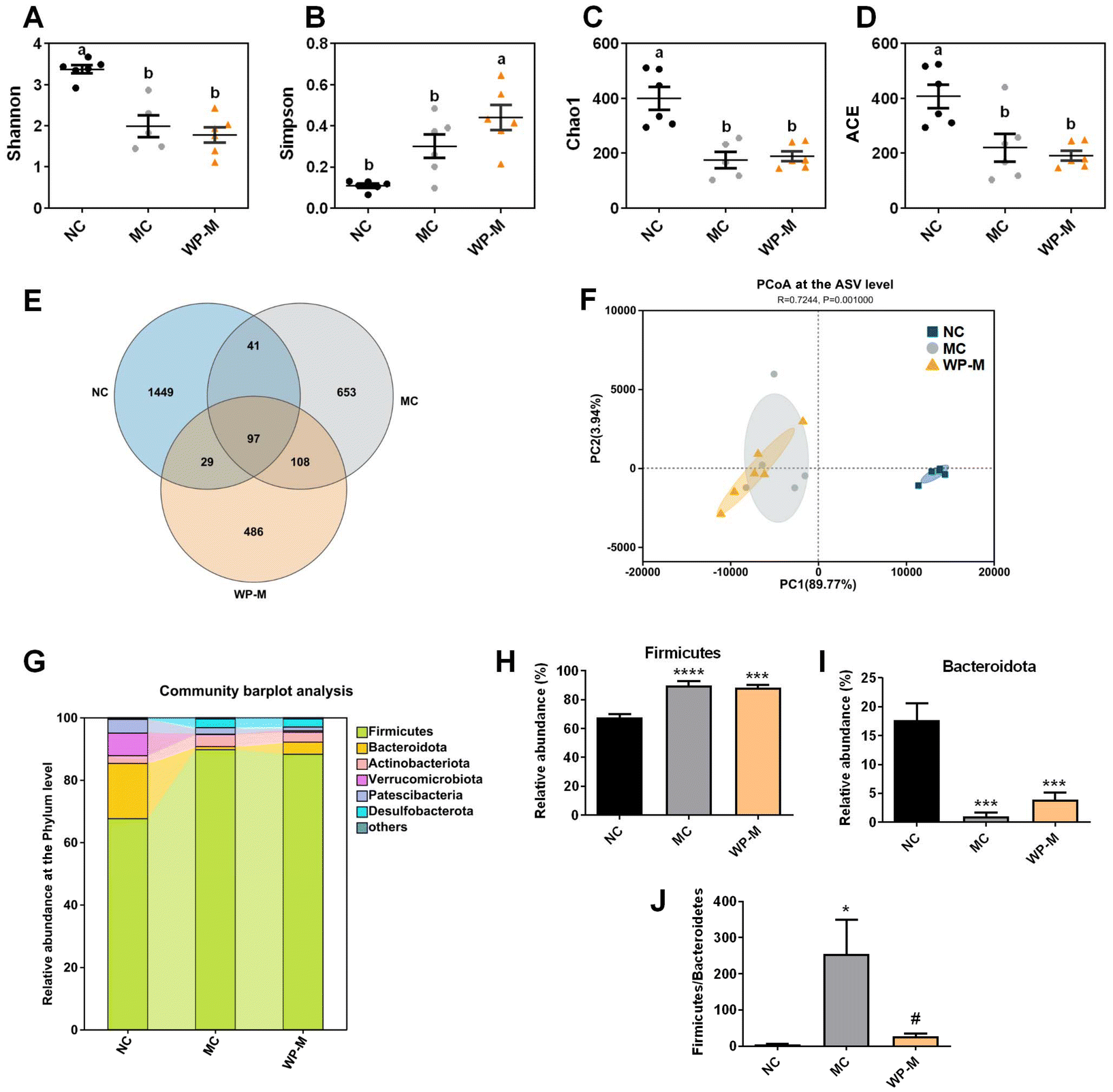 | | Fig. 4 Effects of WP on the structure of the intestinal microbiota in HFD-fed mice. α-Diversity: (A) Shannon index, (B) Simpson index, (C) Chao1 index, and (D) ACE index. (E) OTU Venn diagram between treatments; β-diversity: (F) PCoA at the Asv level. (G) Relative abundance of the gut microbiota at the phylum level. Relative abundance of (H) Firmicutes, (I) Bacteroidetes, and (J) Firmicutes/Bacteroidetes. Data are expressed as mean ± SEM, n = 6. Significance levels: *p < 0.05, ***p < 0.001, and ****p < 0.0001 vs. NC; #p < 0.05 vs. MC. | |