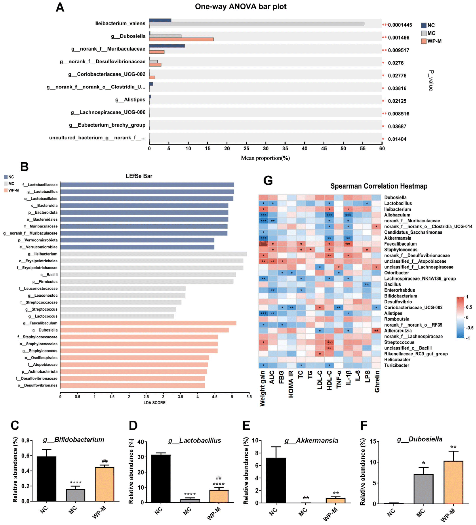 | | Fig. 5 WP intervention changed the composition of the intestinal microbiota. (A) One-way ANOVA bar plot. (B) LEfSe bar plot. The relative abundances of (C) g_Bifidobacterium, (D) g_Lactobacillus, (E) g_Akkermansia, and (F) g_Dubosiella. (G) Correlation analysis of the intestinal microbiota and altered phenotypes. Data are expressed as mean ± SEM, n = 6. Significance levels: *p < 0.05, **p < 0.01, and ****p < 0.0001 vs. NC; ##p < 0.01 vs. MC. | |