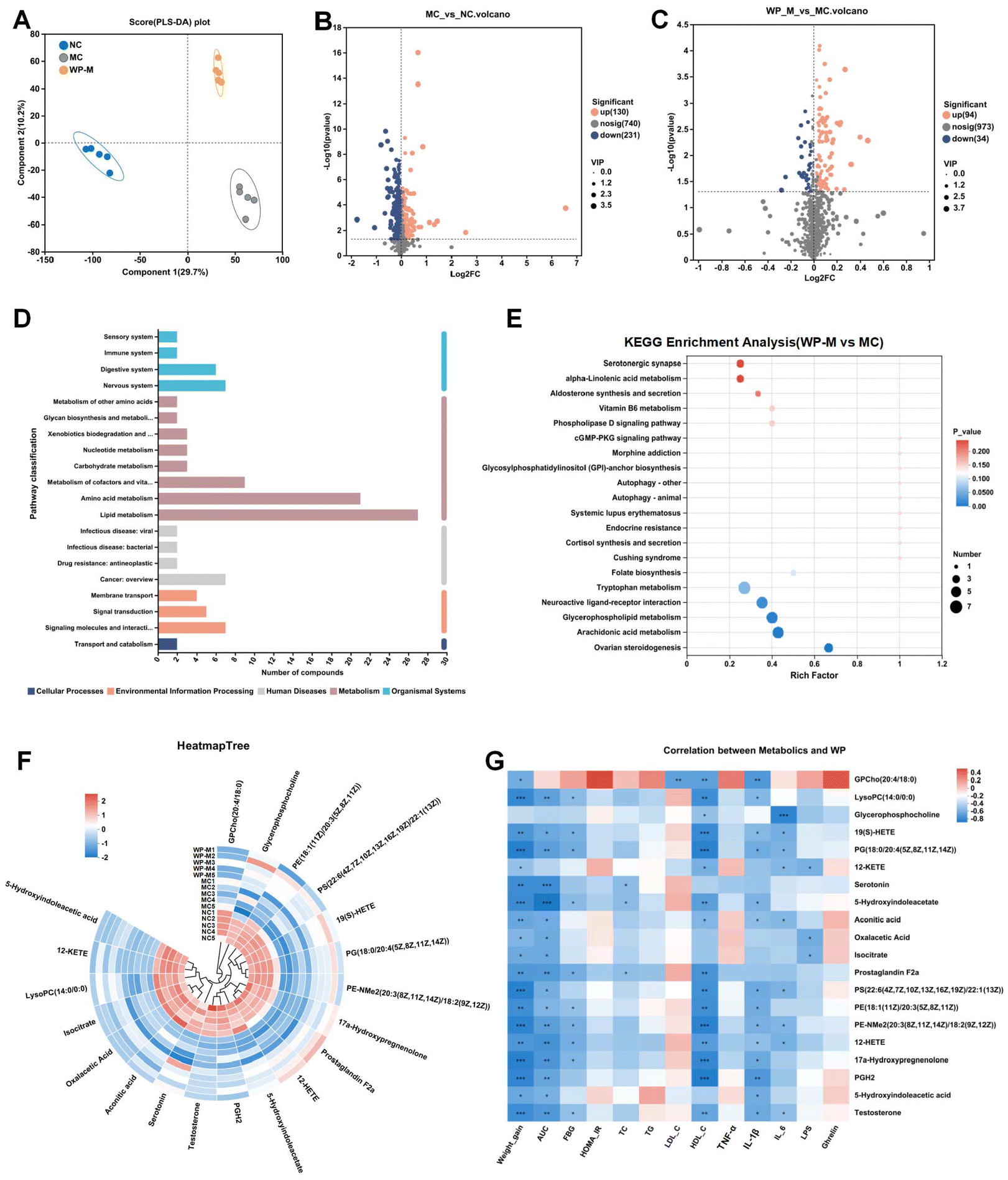 | | Fig. 6 WP altered serum metabolites in HFD-fed mice. (A) PLS-DA, (B) volcano plot (the MC group vs. the NC group), and (C) volcano plot (the WP-M group vs. the MC group). (D) KEGG pathway classification, (E) KEGG pathway enrichment analysis, and (F) heatmap of metabolite clustering. (G) Correlation analysis of differential metabolites and altered phenotypes. n = 5. | |
