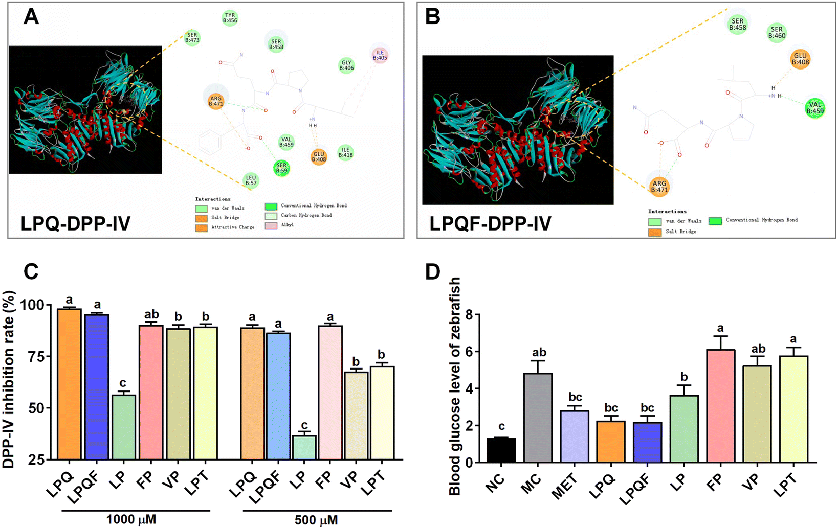 | | Fig. 7 LPQ/LPQF-containing peptides mediate WP's antihyperglycemic effects. (A) Molecular interaction of LPQ with DPP-IV and (B) molecular interaction of LPQF with DPP-IV. (C) DPP-IV inhibition rate of peptides (n = 3), and (D) blood glucose levels in hyperglycemic zebrafish after peptide intervention (n = 30). Significant differences between the groups are denoted by different letters (p < 0.05). | |