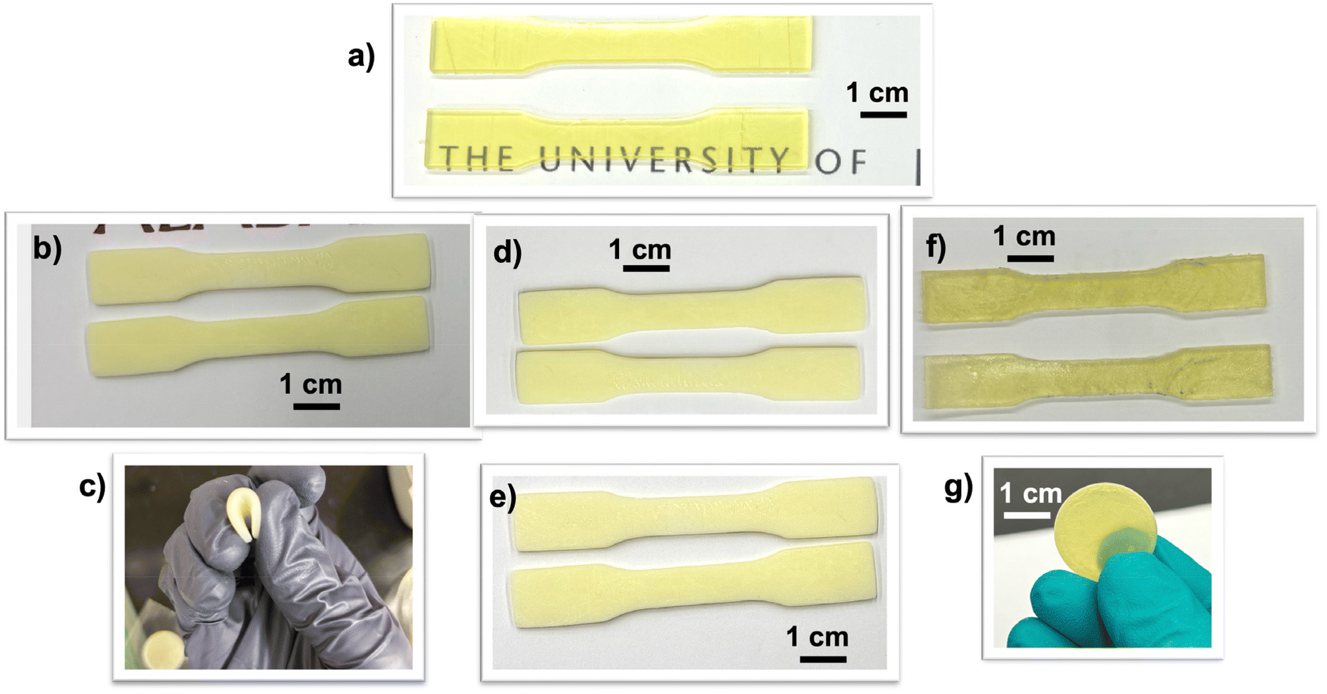 | | Fig. 2 Physical appearance of 3D-printed (a) neat poly(MAA-DEP) and 3D-printed poly(1,3-diether-2-methacrylate)/thermoplastic blends: (b) poly(MAA-DEP)/wPS (5 wt%), (c) poly(MAA-DEP)/wPS (10 wt%), (d) poly(MAA-DBP)/wPS (10 wt%), (e) poly(MAA-DMEP)/wPS (10 wt%) (f) poly(MAA-DEP)/PMMA (5 wt%), and (g) poly(MAA-DEP)/PMMA (10 wt%). Tensile bar specimens’ dimensions (according to ASTM D 638 standards): 82 mm × 12 mm × 2 mm. | |