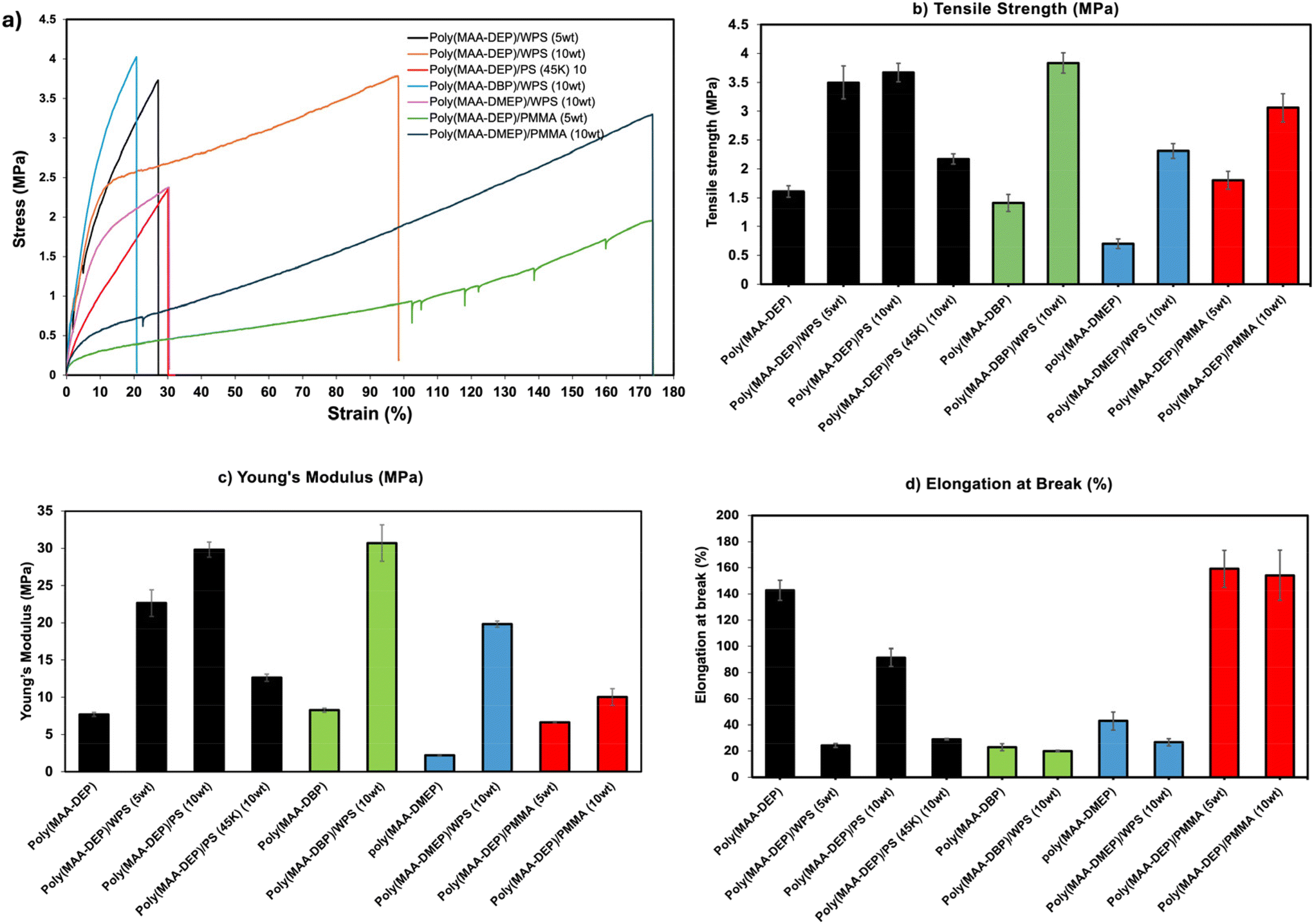 The more pronounced Tg2 shifts observed for the wPS-containing blends might be attributed to the polydisperse nature of the waste polystyrene. Although the Mw of wPS is relatively high (174.7 kDa), its broad molecular weight distribution (PDI = 2.31)45 implies the presence of a significant fraction of lower-molecular-weight chains. These shorter PS chains are likely to be more susceptible to partial interpenetration into the poly(methacrylate) matrix and to plasticization by residual monomers, leading to greater Tg depression.