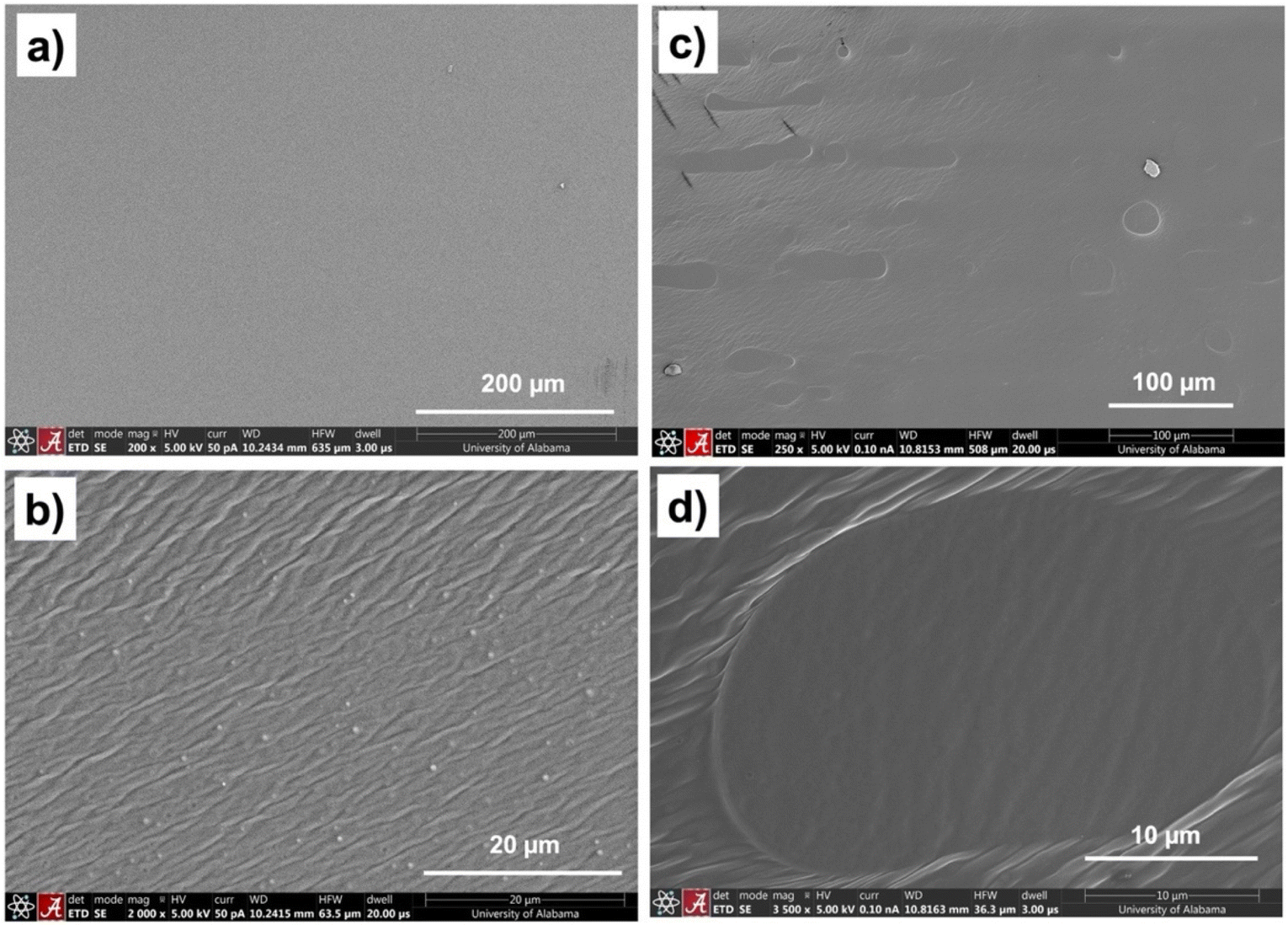 SEM images of 3D-printed poly(MAA-DEP) blends containing 5 wt% and 10 wt% PMMA are presented in Fig. 5. At a lower magnification, Fig. 5a, the 5 wt% PMMA blend exhibits a homogeneous appearance, without characteristic layer-by-layer deposition patterns typically observed in 3D-printed PS-based blends. However, higher magnification (Fig. 5b) reveals a dilute droplet-matrix morphology, characterized by spherical PMMA domains approximately 1 μm in diameter dispersed within the continuous poly(MAA-DEP) matrix. Such morphology is common in blends with low concentrations of the dispersed phase.59 The interfacial adhesion between PMMA droplets and the poly(MAA-DEP) matrix, arising from favorable interactions between their ester functionalities, can enhance interfacial compatibility and reduce phase separation. These interactions facilitate more uniform stress distribution during deformation, promoting energy dissipation and contributing to improved elasticity and toughness60 (Fig. 3d). In contrast, the 10 wt% PMMA blend (Fig. 5c) exhibits larger, oval-shaped PMMA domains with less uniform dispersion, predominantly concentrated near the top of each printed layer with no distinct interlayer boundaries. Despite the significantly increased domain size, these PMMA regions maintain strong interfacial adhesion with the poly(MAA-DEP) matrix, as evidenced in Fig. 5d. The presence of larger domains may introduce stress concentration points; however, the overall matrix continuity is preserved, with the polymer matrix connected at several locations across each layer. This interconnected structure contributes to a continuous matrix, which is essential for maintaining mechanical integrity.