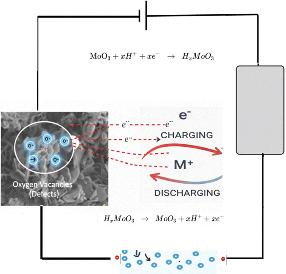 Scheme 2 illustrates the proposed charge-storage mechanism for the Mo-based electrodes in 1 M H2SO4. In S1 (thermally annealed MoO3 nanoflakes), the porous, interconnected architecture facilitates rapid diffusion of protons and redox-active species, which initially occupy confined states before transitioning to adsorbed or surface redox-active states where electron transfer occurs. The high density of oxygen vacancies further enhances electrokinetics by improving electronic conductivity, accelerating proton insertion/extraction, and providing additional active sites that strengthen surface redox reactions, resulting in the highest capacitance (755 F g−1 from CV, 325 F g−1 from GCD), in agreement with previous reports highlighting the benefits of defect-rich, porous morphologies for supercapacitor performance.58,59