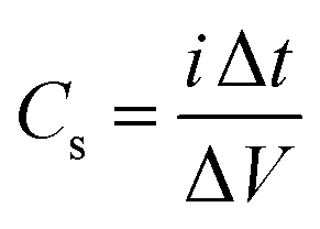 Cyclic voltammetry (CV) was performed at scan rates from 5 to 100 mV s−1 in the 0–1 V range. Galvanostatic charge–discharge (GCD) measurements were carried out at current densities from 1 to 5 A g−1. Electrochemical impedance spectroscopy (EIS) was performed in the frequency range 105–10−2 Hz. The specific capacitance Cs was calculated from the CV and GCD data using the following equations: