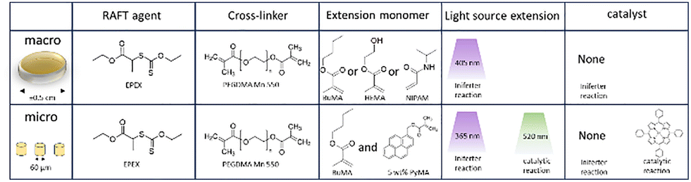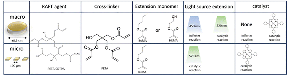 In this work, we explored potential advantages discussed in the introduction of post-modification using RAFT polymerization by looking at three different approaches, schematically shown in Fig. 2. For each approach a photopolymerizable mixture (commonly named resist) is prepared that contains materials suitable for RAFT controlled polymerization. These resists are designed for 2-photon lithography, but can also be polymerized by UV irradiation at a larger scale. All of the resists are therefore first scrutinized on the macroscale before scaling the process down aiming for similar effects. The macroscale samples are shaped like discs of 0.1 cm thick and a diameter of approximately 0.5 cm, while the microstructures prepared by TPP are shaped like pillars of varying size.