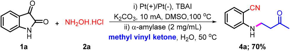 In summary, we have developed an electricity-mediated, sustainable protocol for the efficient synthesis of 2-aminobenzonitriles from isatins and hydroxylamine as starting materials. This strategy overcomes the limitations of previously reported methods that often require harsh reaction conditions, metal catalysts, or costly substrates. A range of substituted 2-aminobenzonitriles were obtained in good yields directly from the corresponding substituted isatins. Furthermore, the electrochemically synthesized 2-aminobenzonitriles were successfully functionalized in a one-pot process by integrating electrochemical synthesis with α-amylase-catalyzed aza-Michael addition, affording clinically valuable β-amino carbonyl compounds. Furthermore, control experiments and cyclic voltammetry studies were conducted to gain mechanistic insight into the integrated protocol. Overall, this protocol highlights the potential of electrochemically driven C–C bond cleavage in isatin chemistry.
