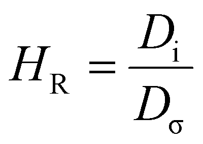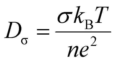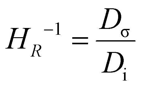 in which Dσ is the charge diffusion coefficient estimated from the experimentally measured conductivity (σ), kB is the Boltzmann constant, T is the absolute temperature, n is the free ion concentration, and e is the charge of the free ion.47,65 Dσ is usually different from the self-diffusion coefficient of the ions, Di, which can be obtained from solid-state nuclear magnetic resonance spectroscopy.47 This phenomenon is expressed by the Haven ratio, HR [eqn (4)], or the inverse of the Haven ratio, HR−1 [eqn (5)].65| |