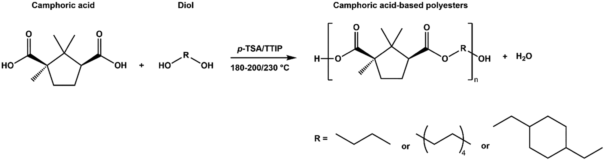 | Scheme 1 Bulk polymerization of camphoric acid and various diols using either p-TSA or TTIP as catalysts. | ||