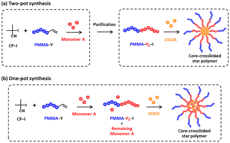 | Scheme 2 (a) Two-pot synthesis and (b) one-pot synthesis of core-crosslinked PMMA–PA star polymers from PMMA–Y. | ||