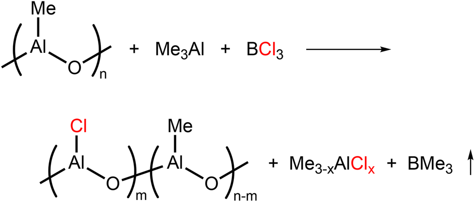 To simplify the catalyst composition, an aluminum compound containing a smaller amount of halogen per aluminum would be a promising candidate as a reagent sufficient to activate Nd carboxylate precursors by itself. Very recently, we have developed halogenated aluminoxane cocatalysts derived from commercially available MAO and BCl3.29 The resulting cocatalyst activated Ni-diimine catalysts in a similar manner to halogen-free MAO and promoted ethylene polymerization. The ethylene polymerization behavior, particularly the branching frequency, was strongly dependent on the degree of halogenation. Here, the structural replacement of methyl groups in MAO with the halogen was indicated by NMR and X-ray total scattering measurements with pair distribution function (PDF) analyses (Scheme 2). Therefore, the halogenated MAO simultaneously behaves as an alkylating reagent and a halogen donor for metal precursors.